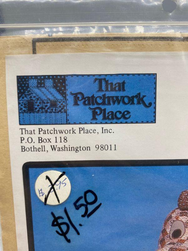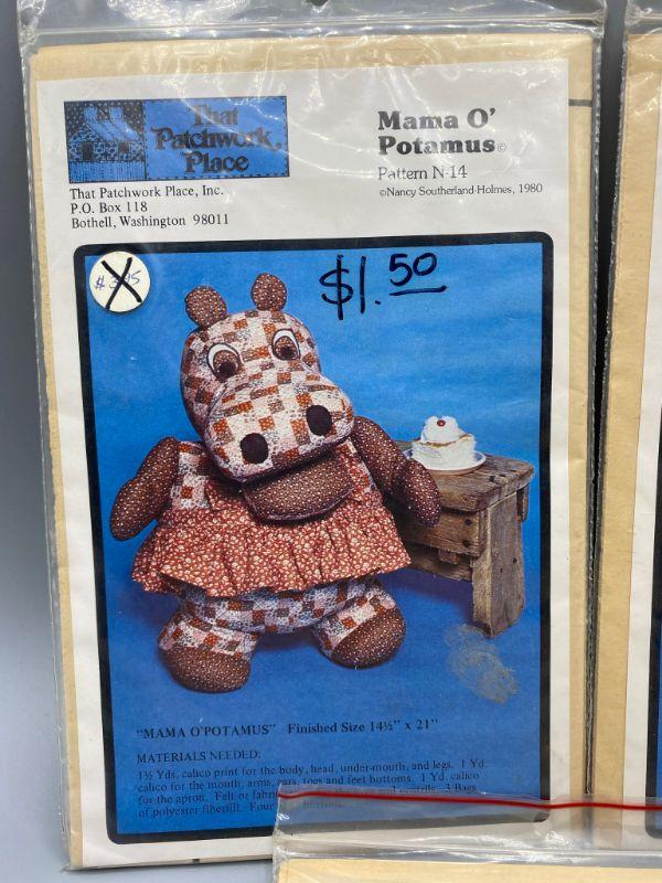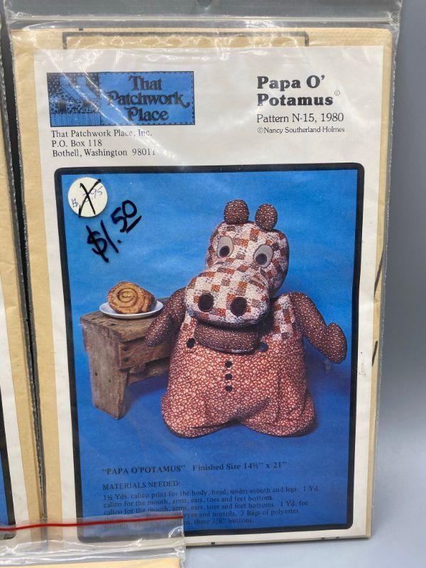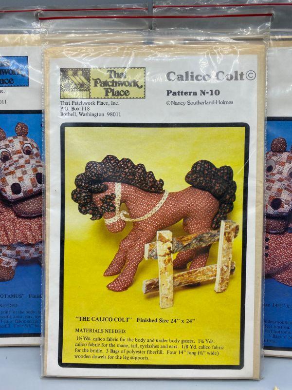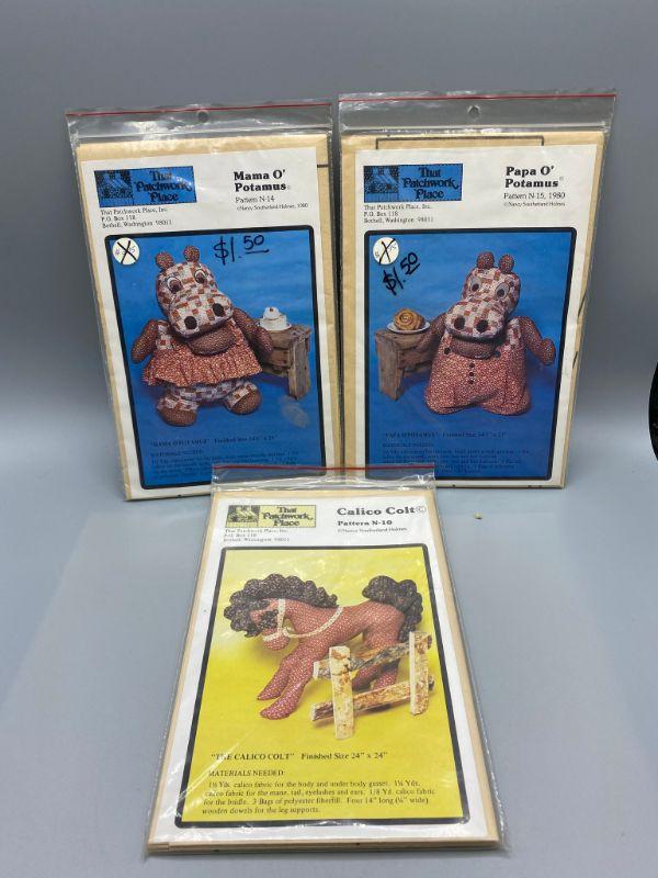 Set of 3 uncut patterns from That Patchwork Place. Mama O' Potamus, Papa O' Potamus, and Calico Colt. Early 1980s.