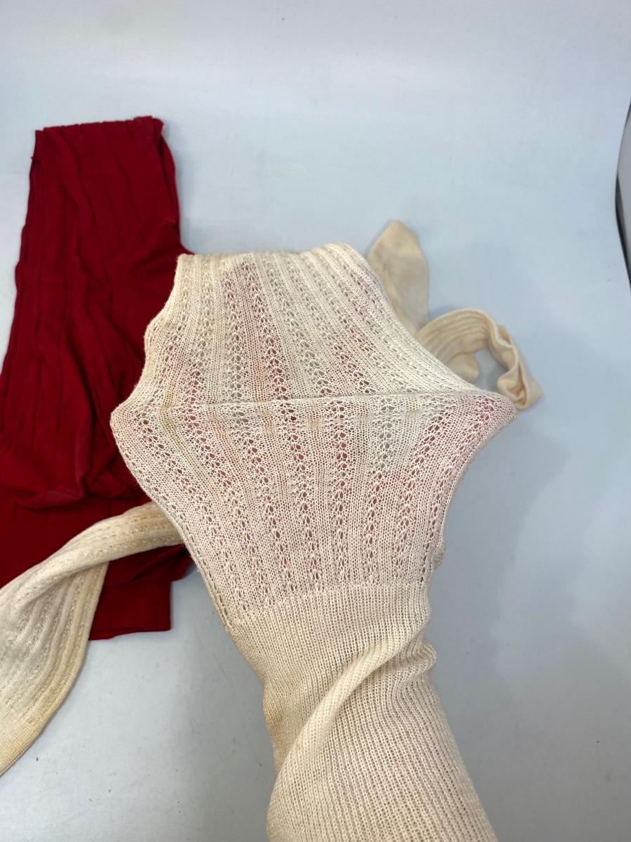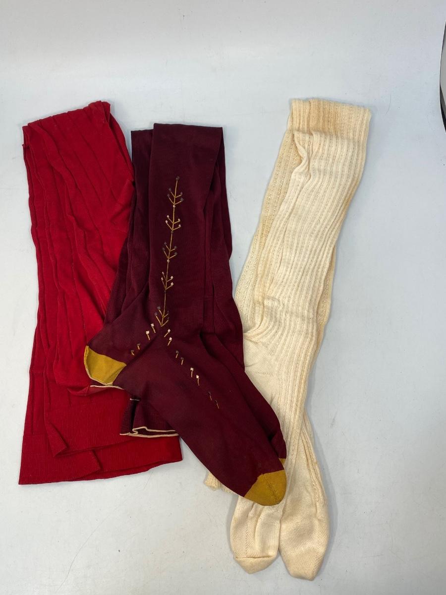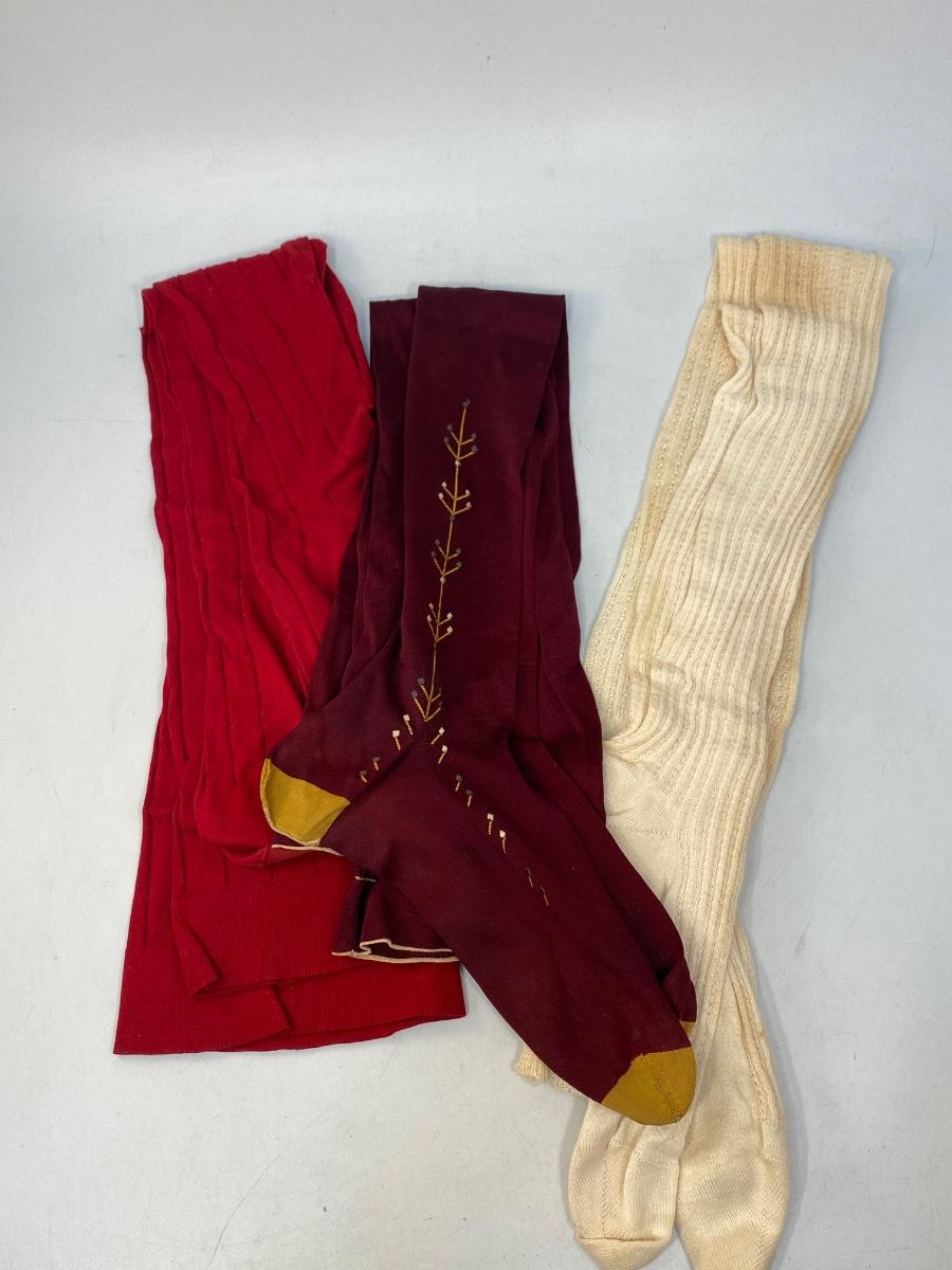 Set of 3 Vintage Thigh High Stocking Socks Nylons Red & White. The white pair have discolor. The dark burgundy and gold toe have a leaf vine embroidered detail at the ankle. All are in gently used condition, may have small holes but are probably wearable.