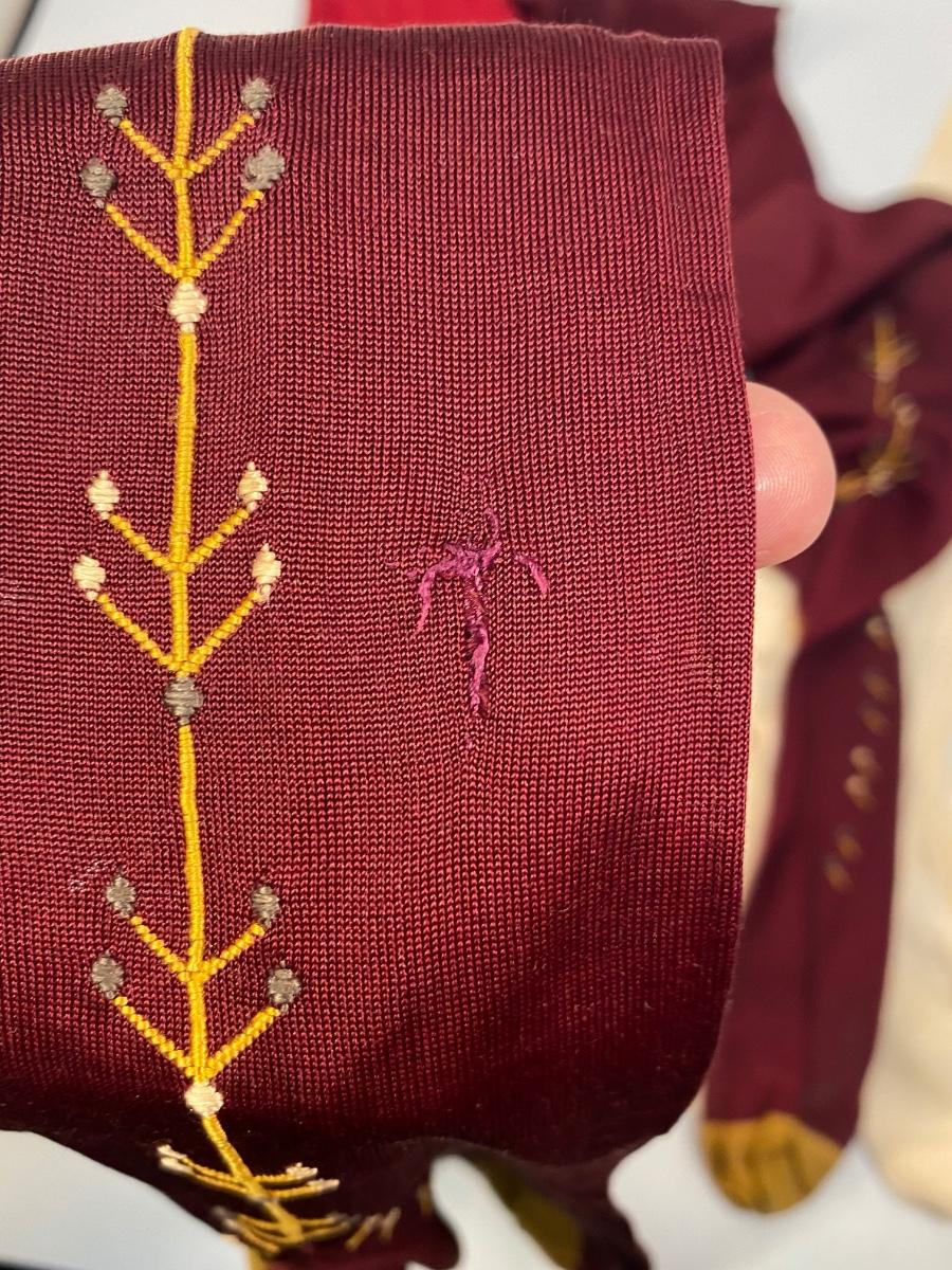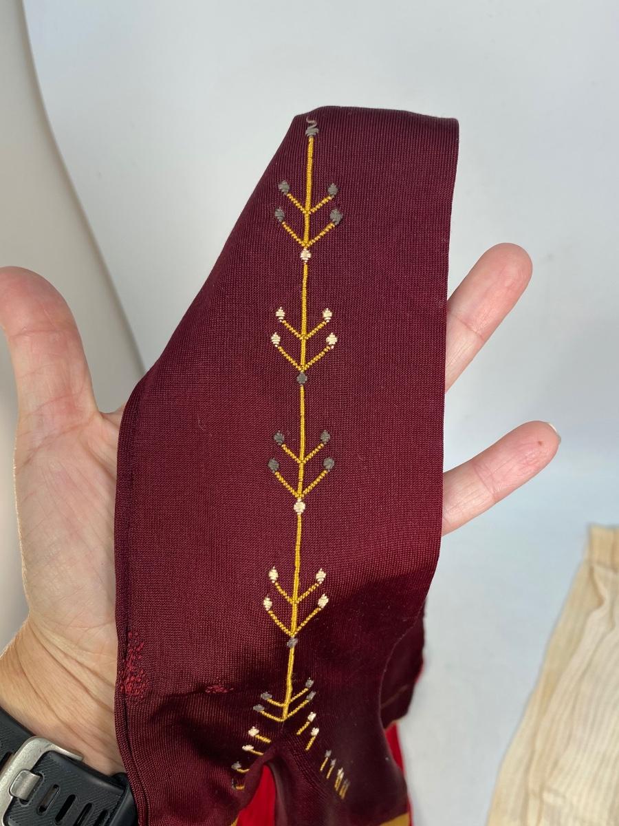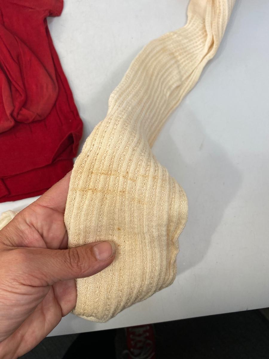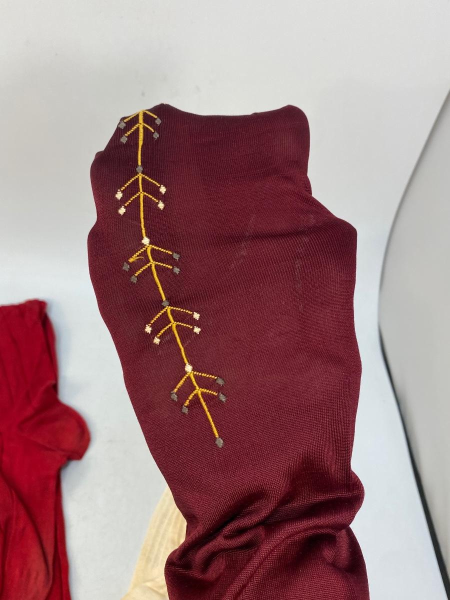 Set of 3 Vintage Thigh High Stocking Socks Nylons Red & White. The white pair have discolor. The dark burgundy and gold toe have a leaf vine embroidered detail at the ankle. All are in gently used condition, may have small holes but are probably wearable.