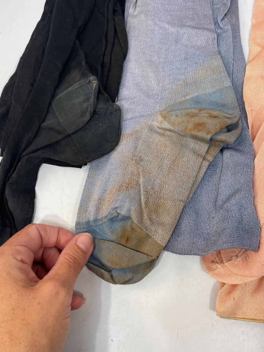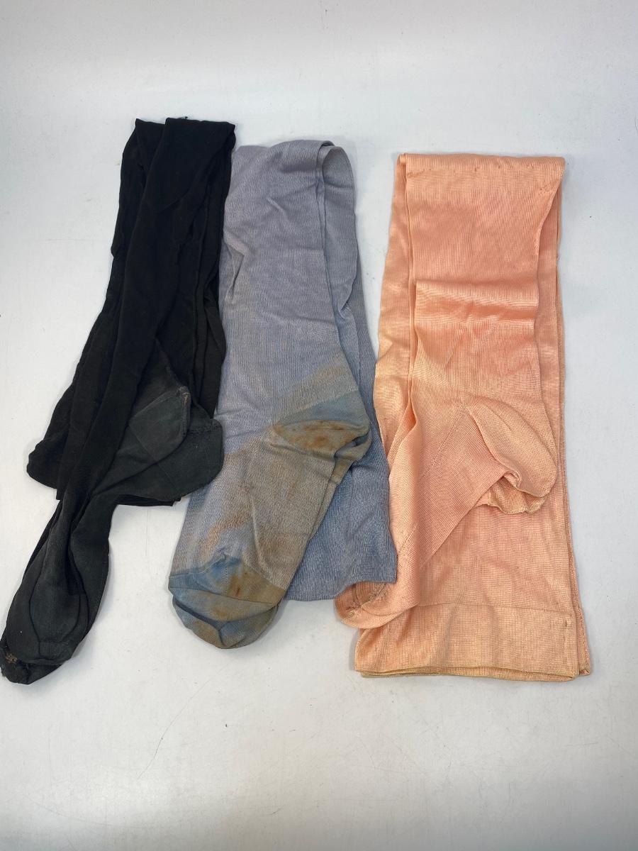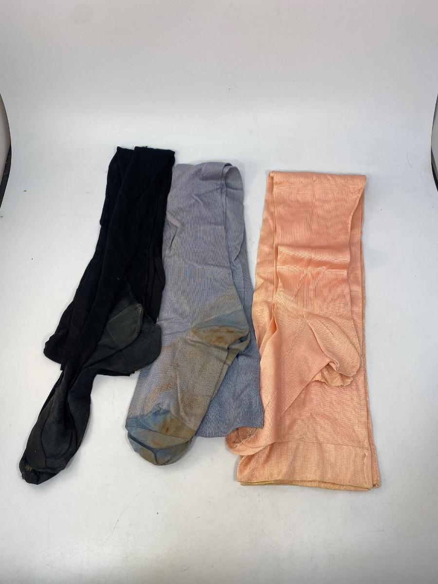 Set of 3 Vintage Thigh High Stocking Socks Nylons Black, Blue, Peach. Previously worn. There is discolor and may be small holes.