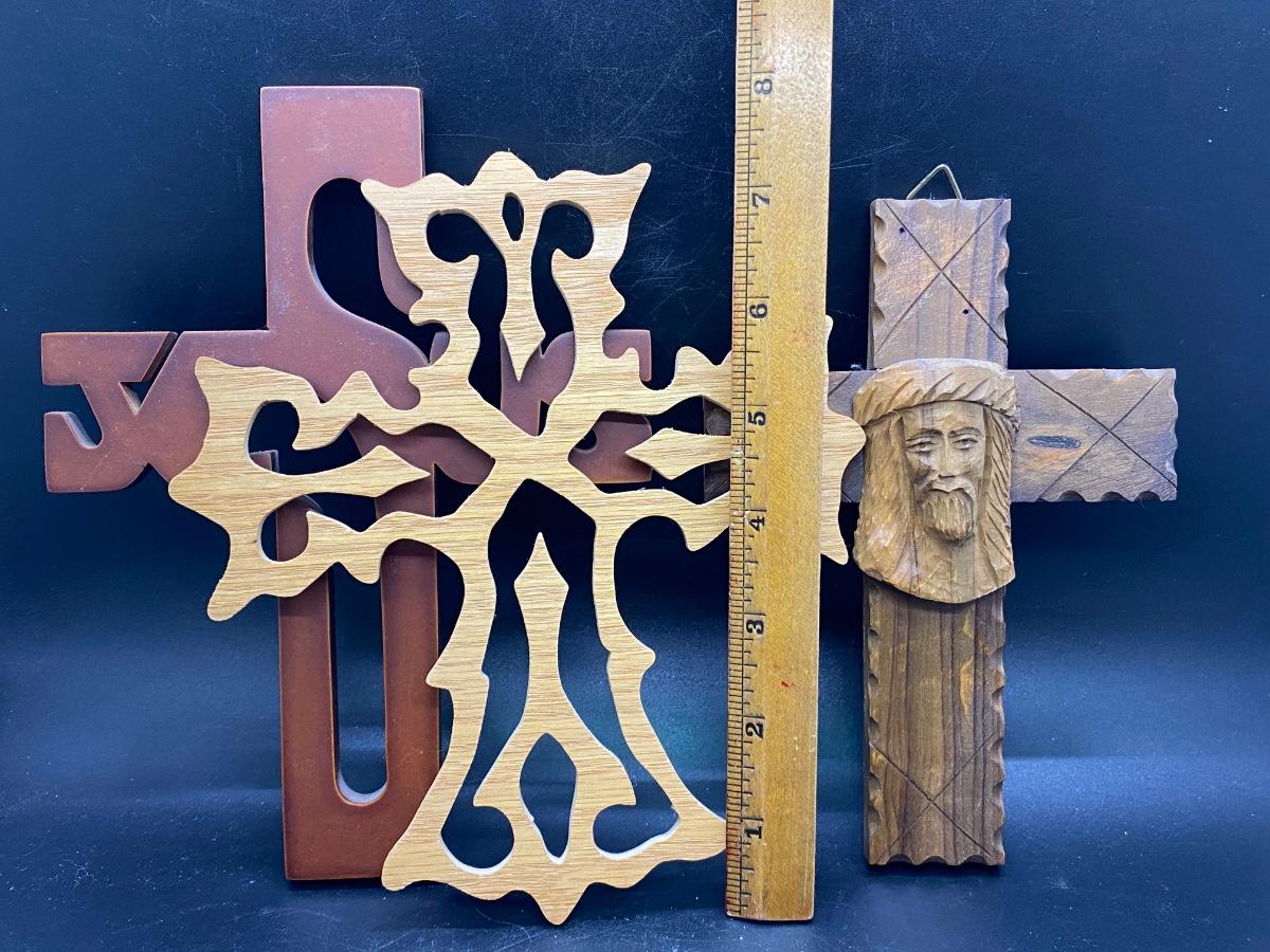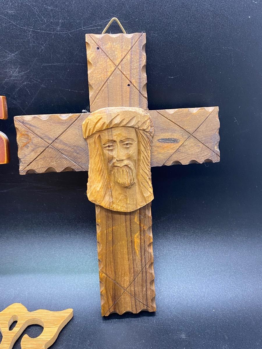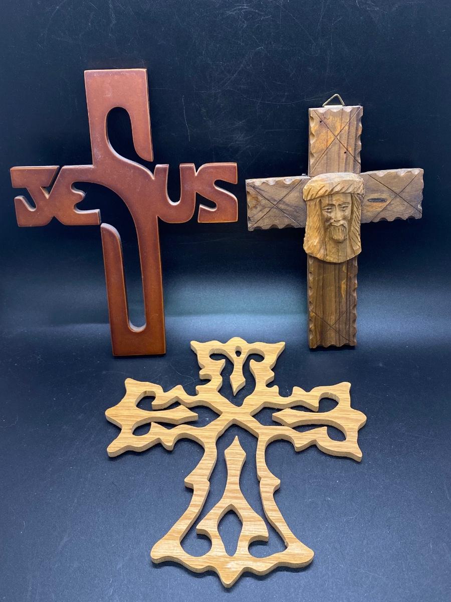 Set of 3 wall hanging wood crosses. Each very different from the other. The carved one with Jesus' face on it is stamped Jerusalem on the back. Between 7" and 8" size.