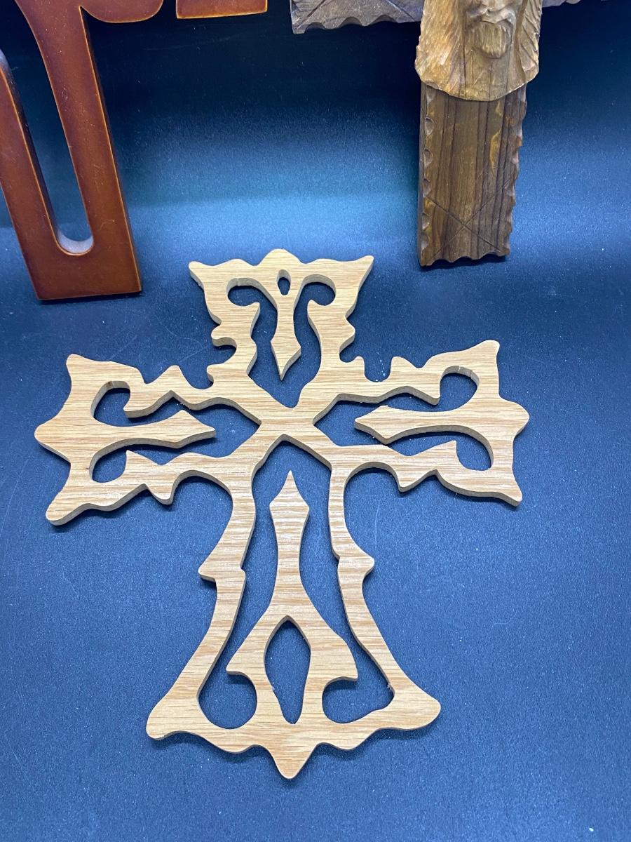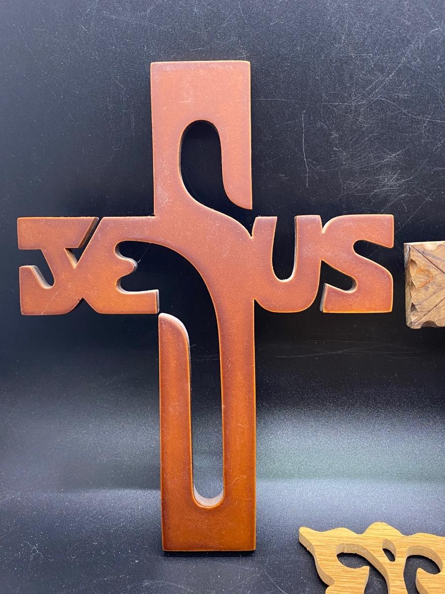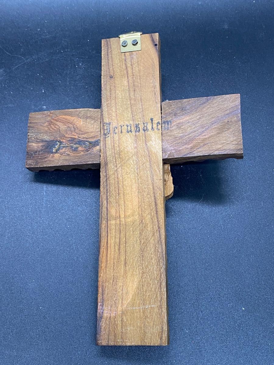 Set of 3 wall hanging wood crosses. Each very different from the other. The carved one with Jesus' face on it is stamped Jerusalem on the back. Between 7" and 8" size.