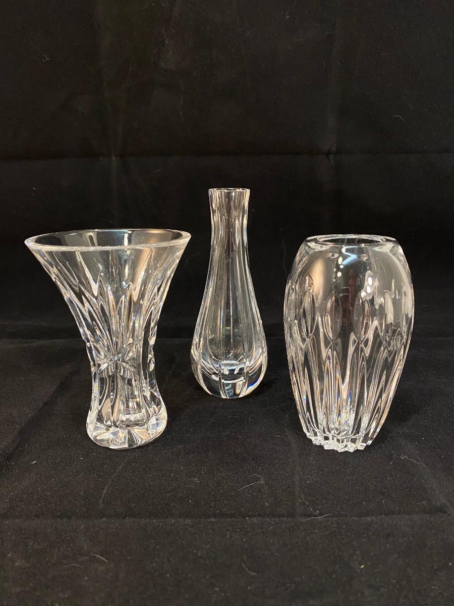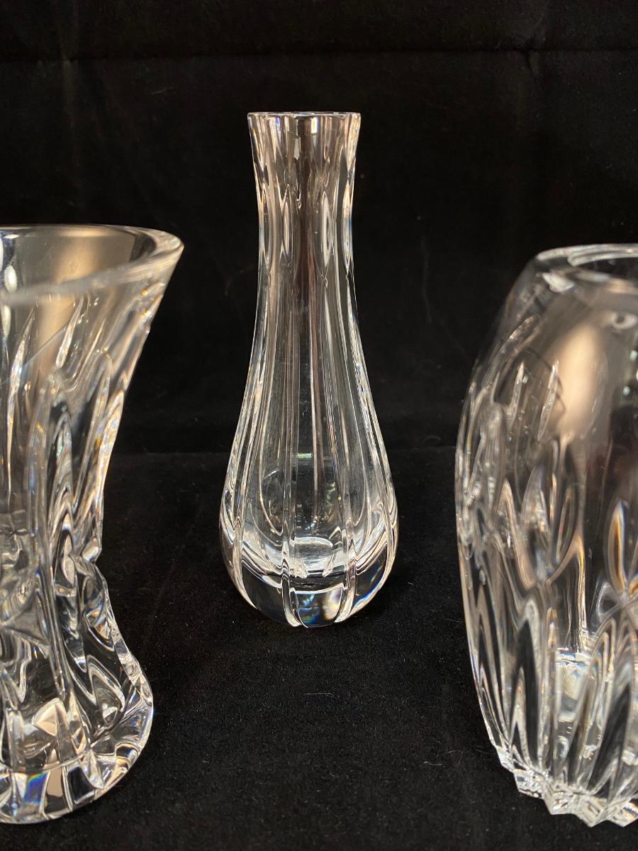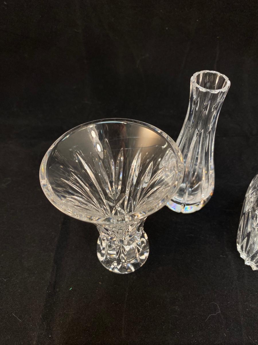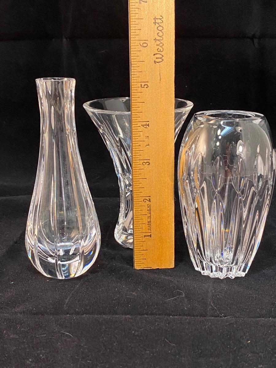 Set of 3 Waterford Crystal Small Bud Vases. All in good condition. Each one different. Between 4" and 5" sizes. All stamped Waterford.