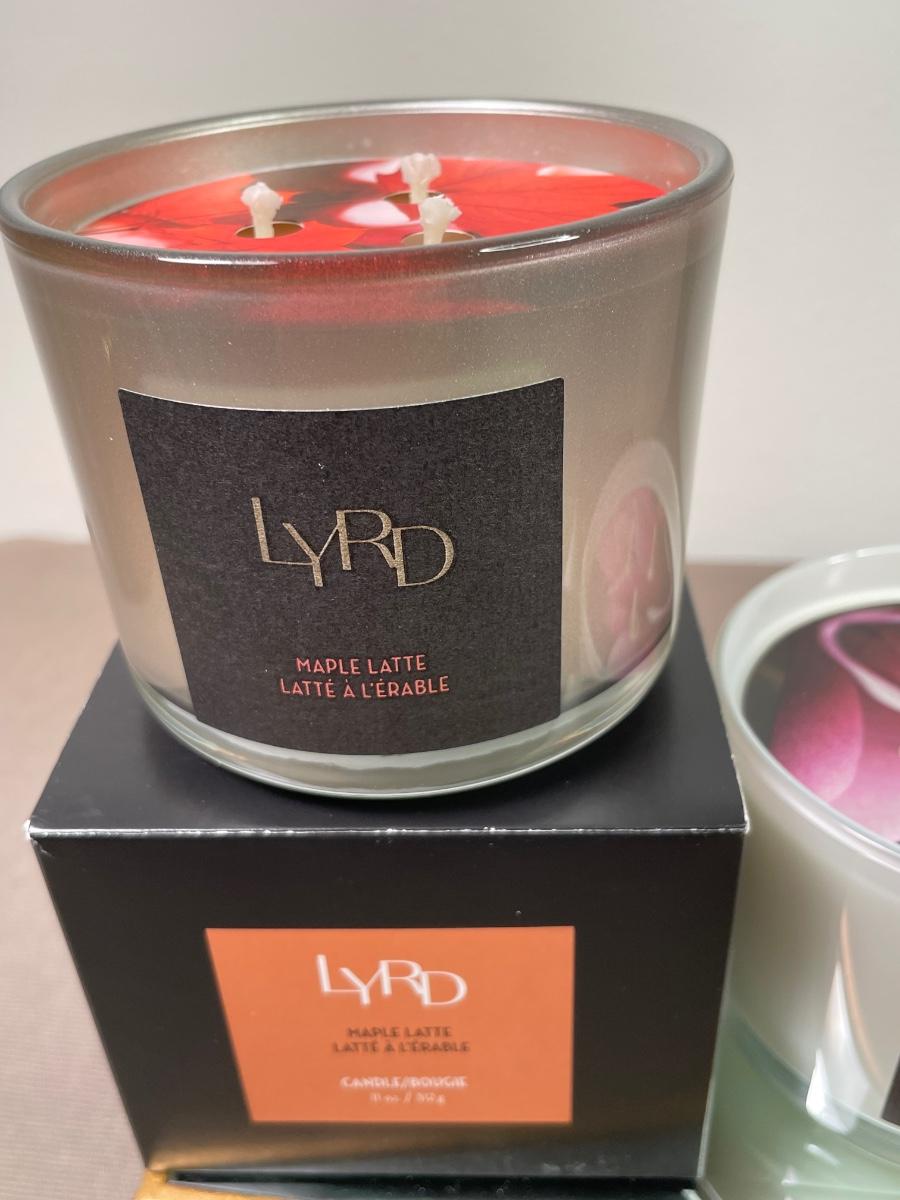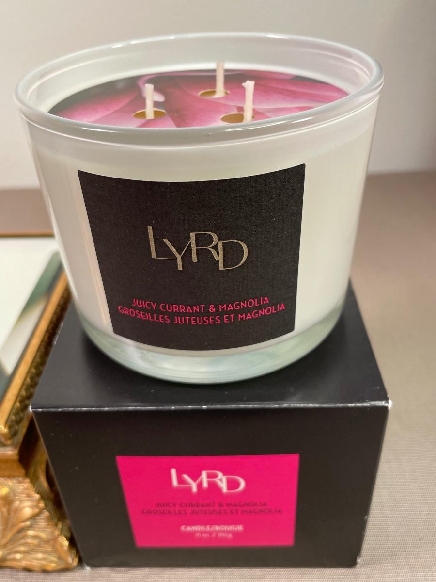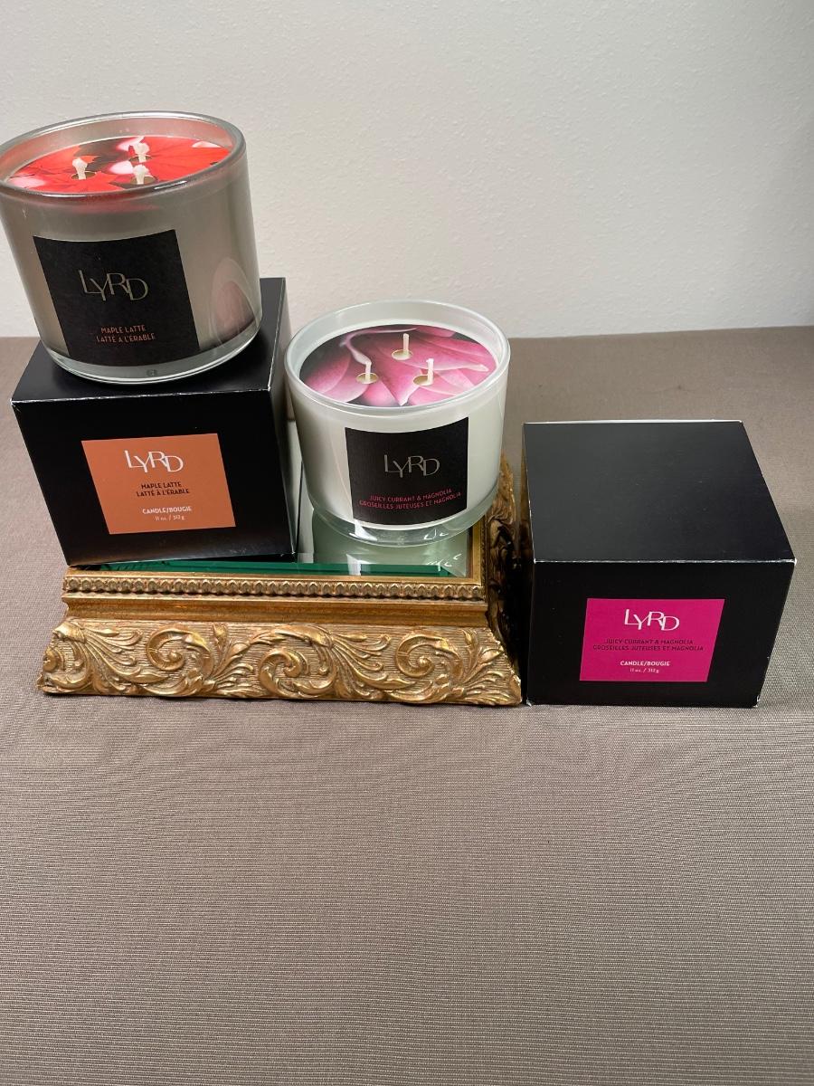 New in box LYRD 3 wick candles. Juicy Currant and Magnolia, plus Maple Latte.