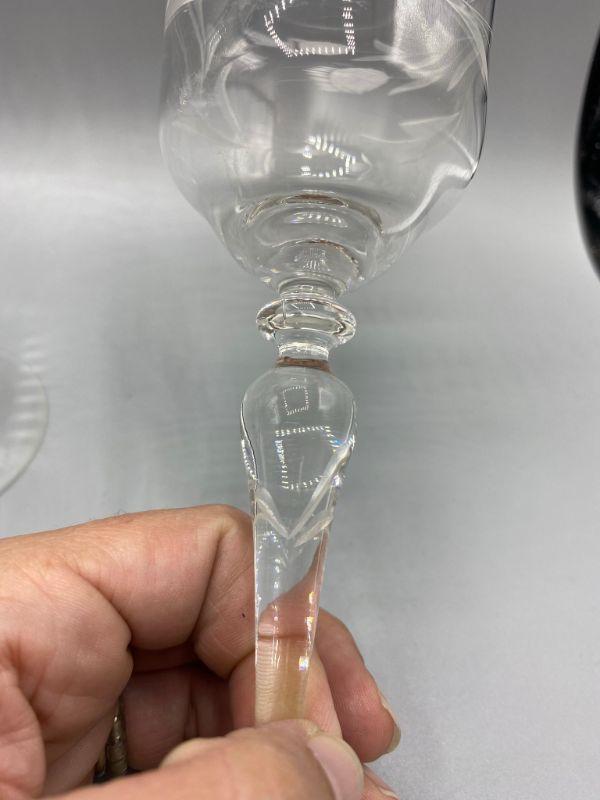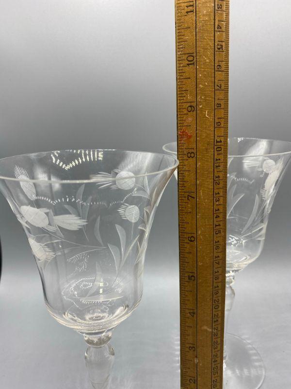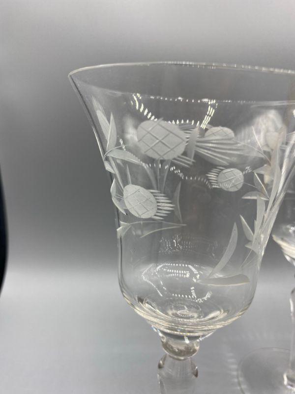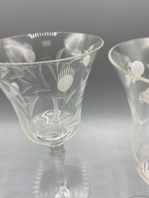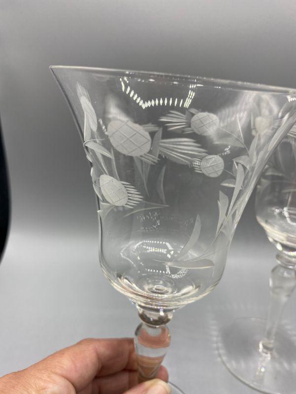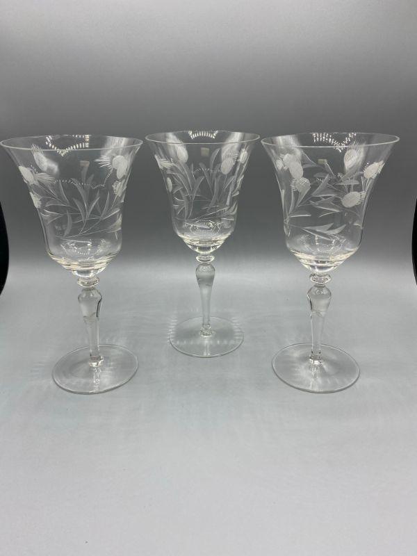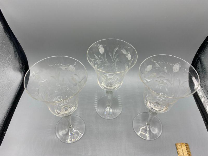 Set of 3 etched wine glasses. Have a flower/ pineapple design to them. Good Condition.