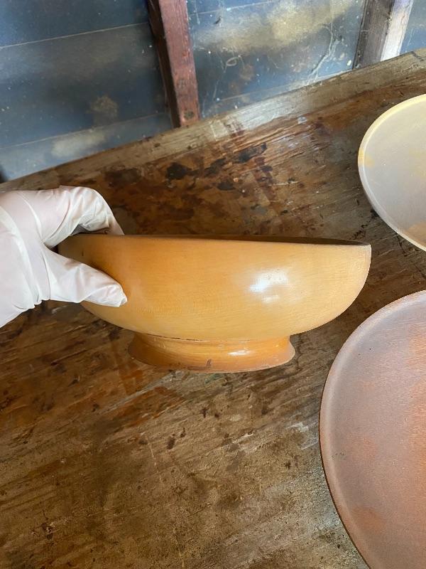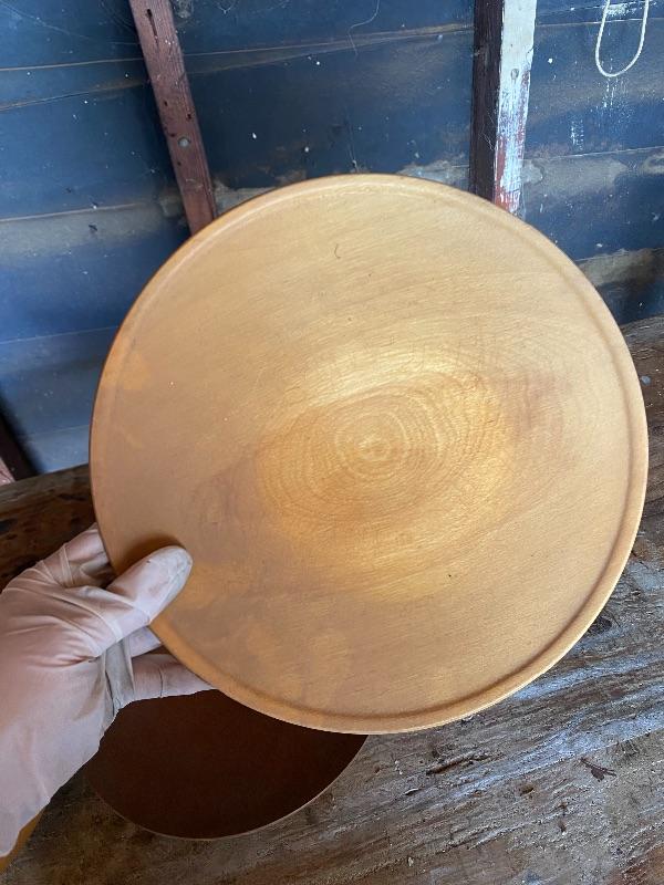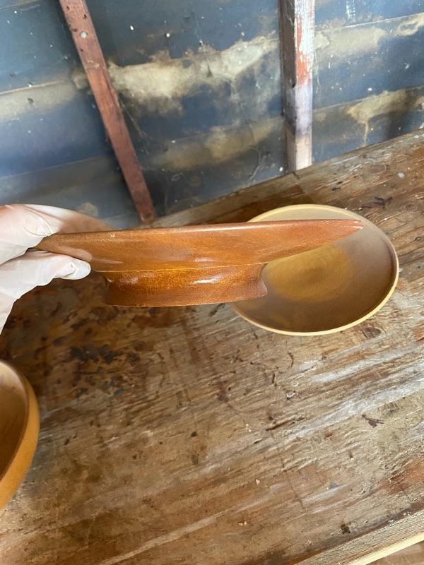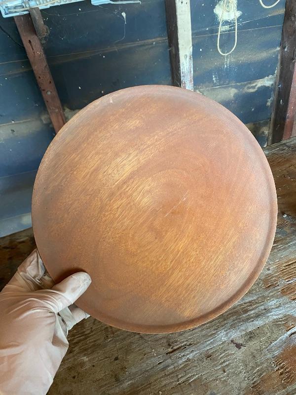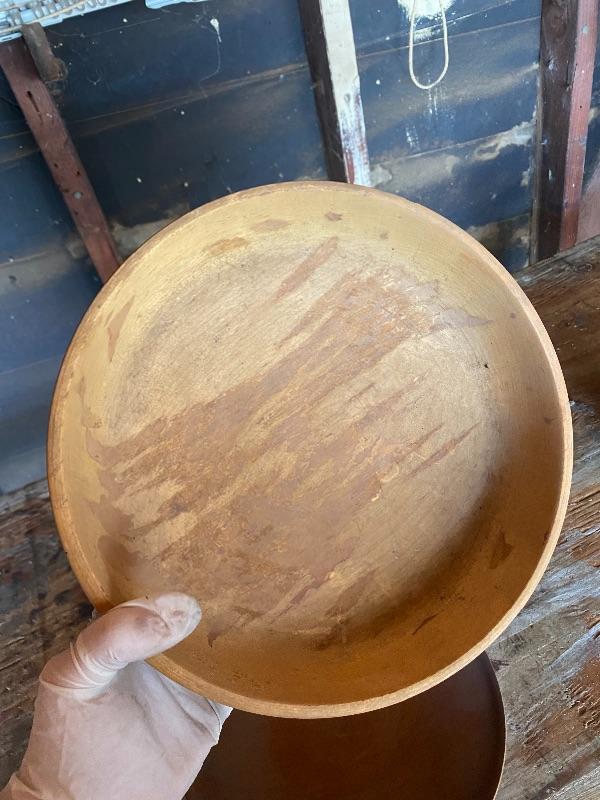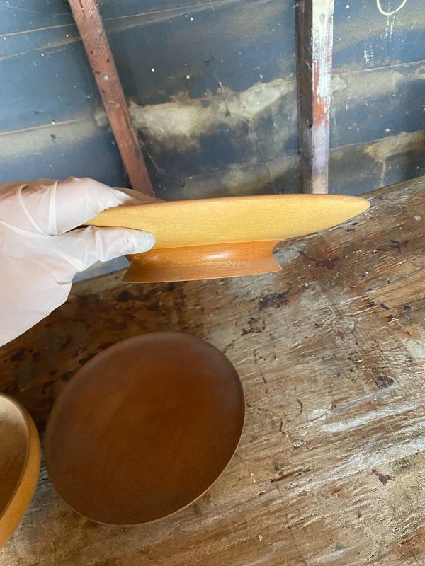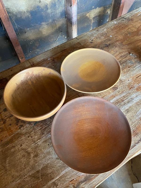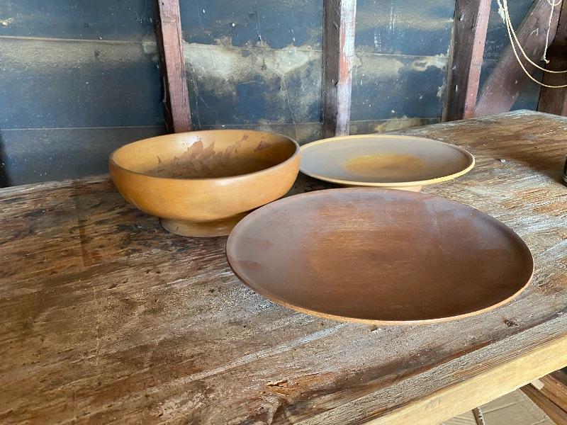Set of 3 vintage wood serving pieces. One bowl and 2 footed plates. All three are in good condition no major scratches or dings. They are dusty and could use a good cleaning.