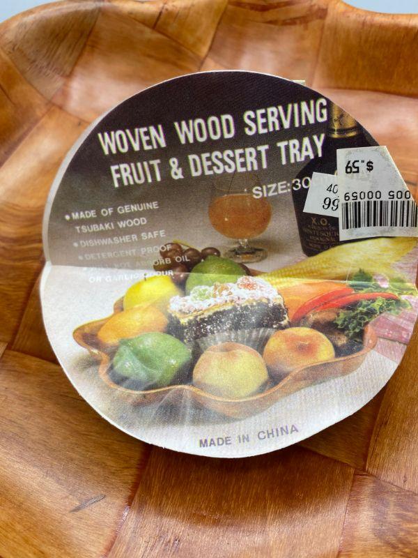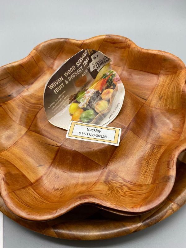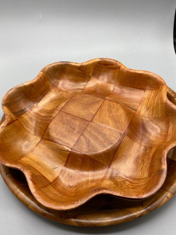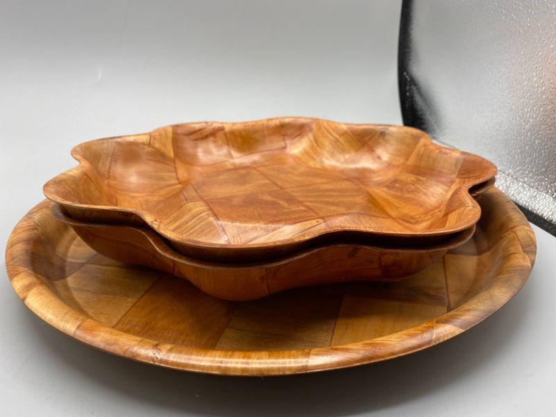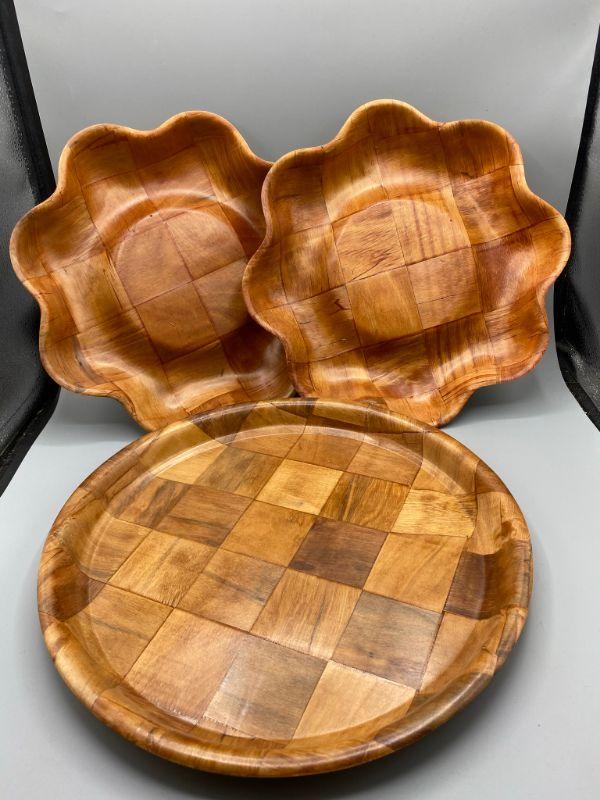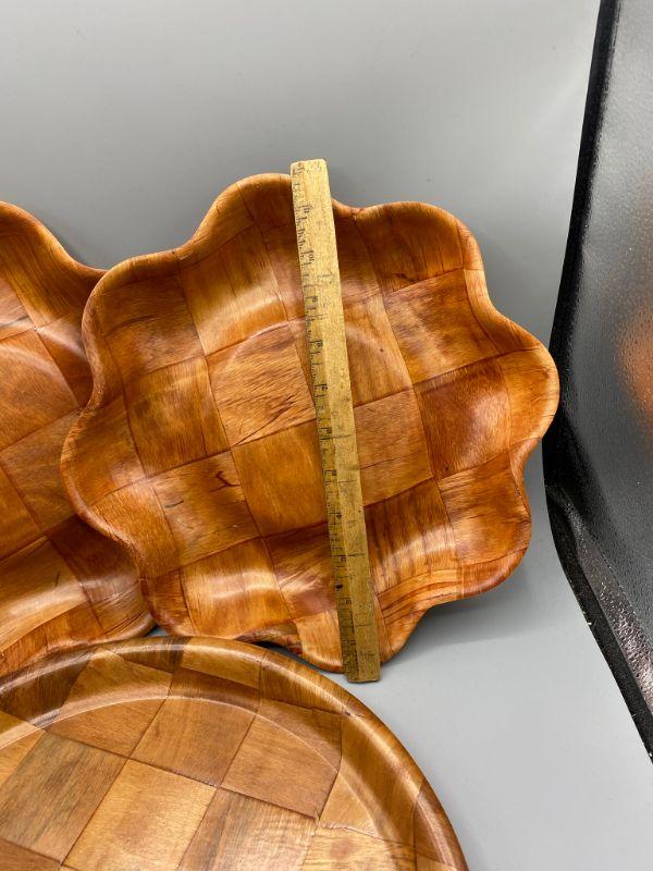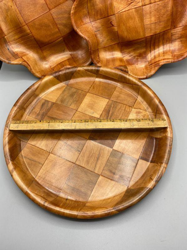 Set of 3 woven wood serving trays. One round and 2 scalloped. Great vintage condition. About 12" size.