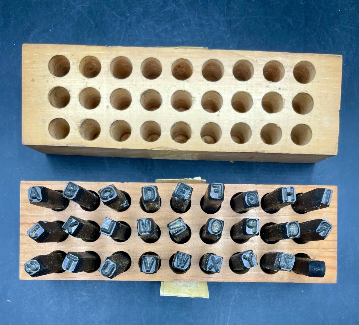 Full set of 27 stamps: 26 letters and one pointed stamp for making a "period". Excellent condition.