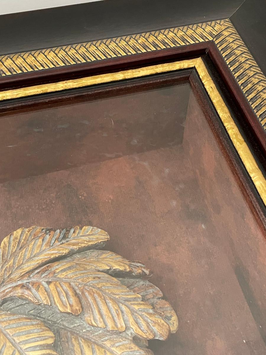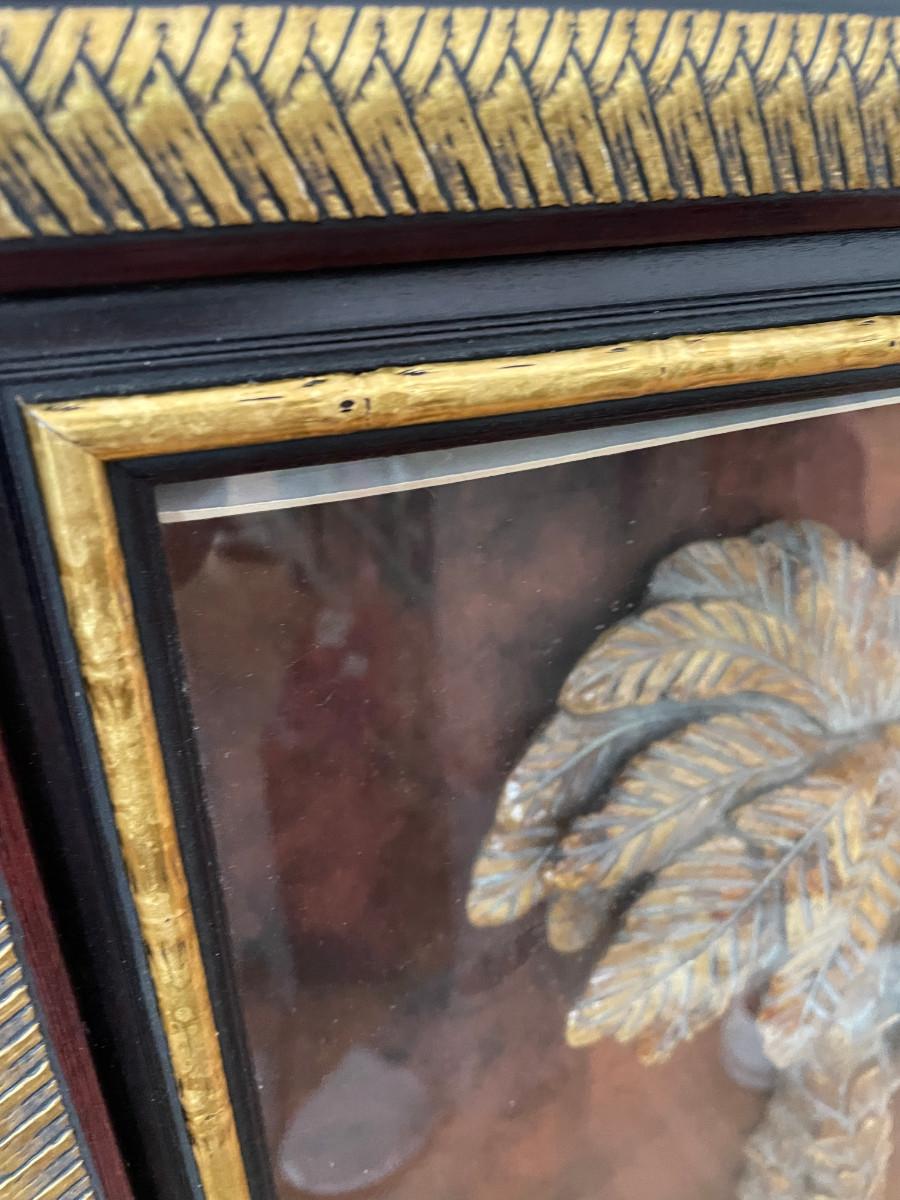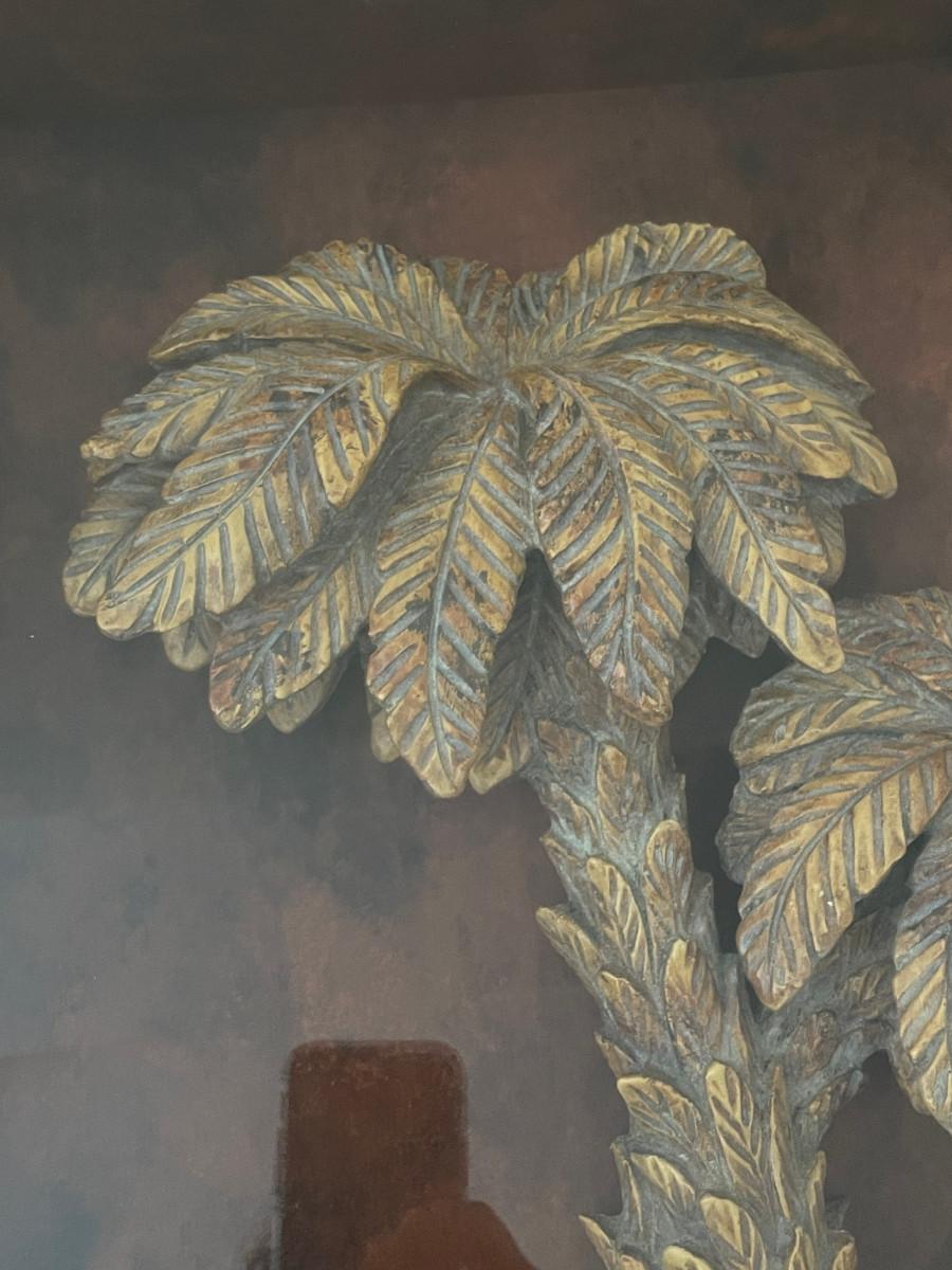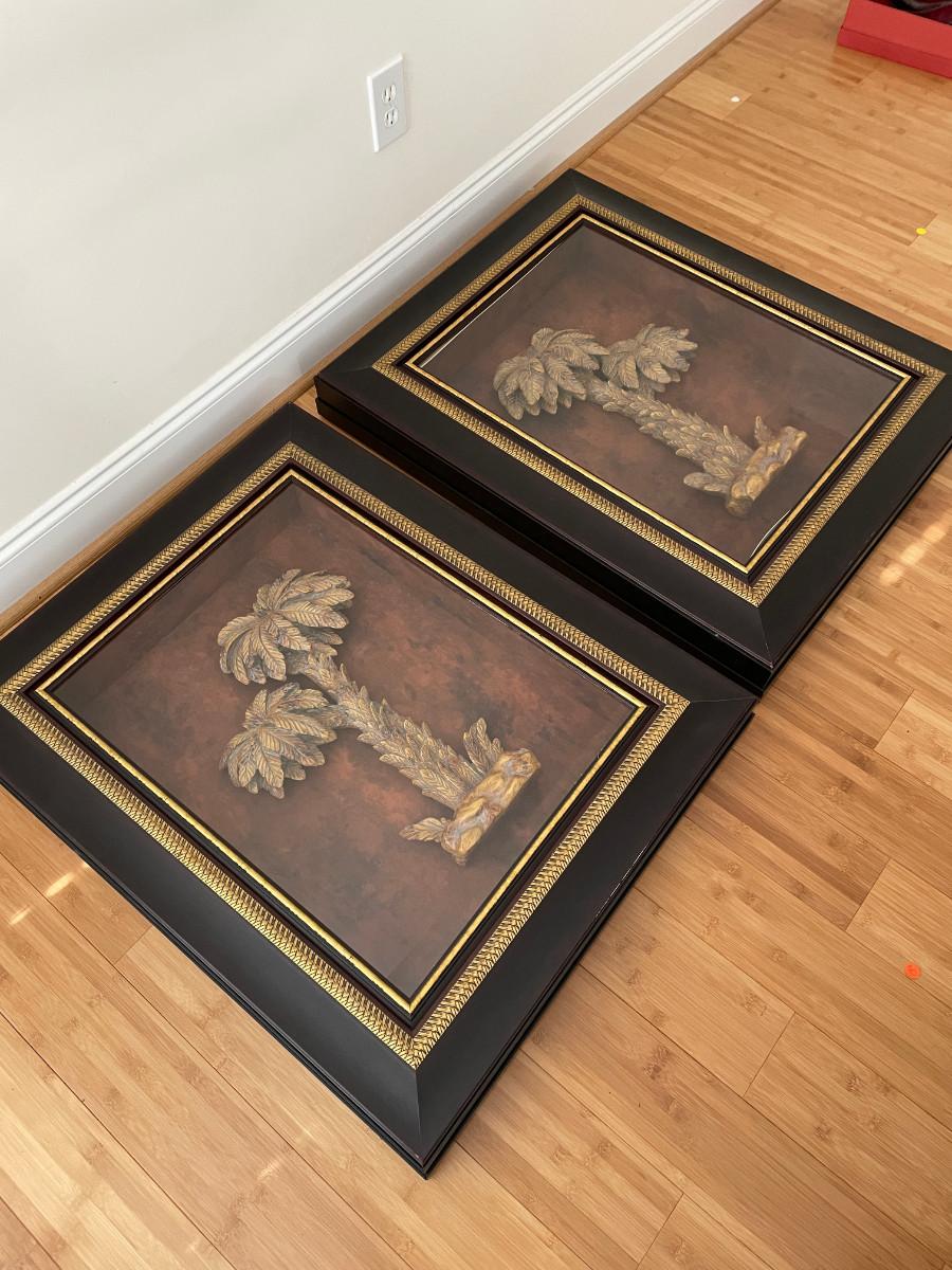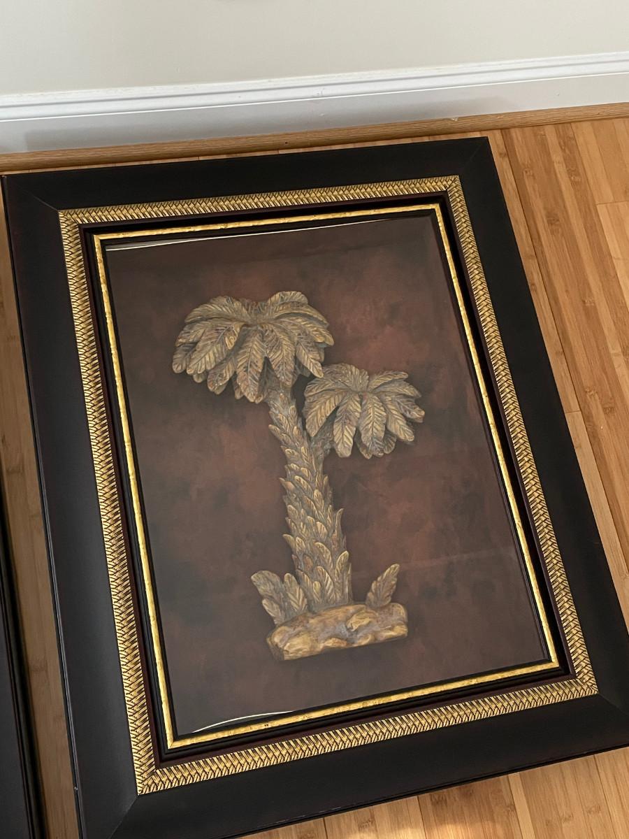 2 Matching Palm Tree Themed Wall Art Pieces. Hand-painted by owner who was a professional painter. See photos for condition - they do have some flaws inside the glass (could possibly be repaired). Approximately 36” tall, 28.75” wide, and 3.75” deep.