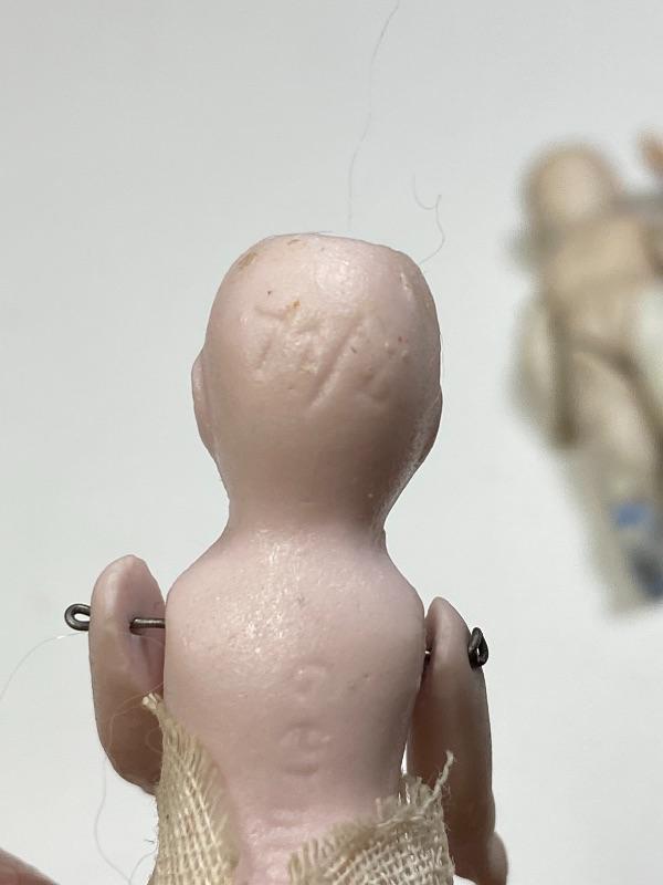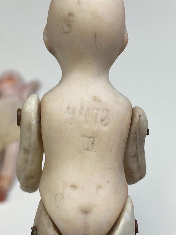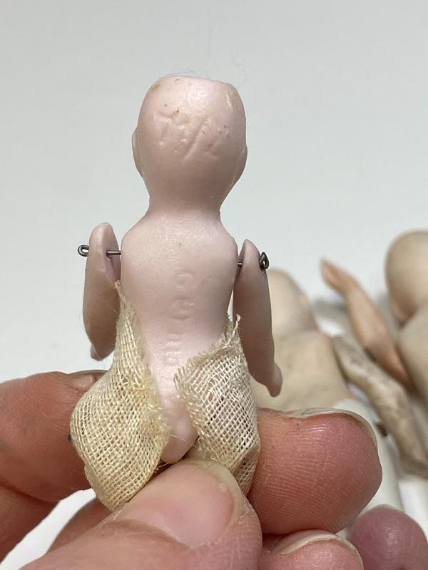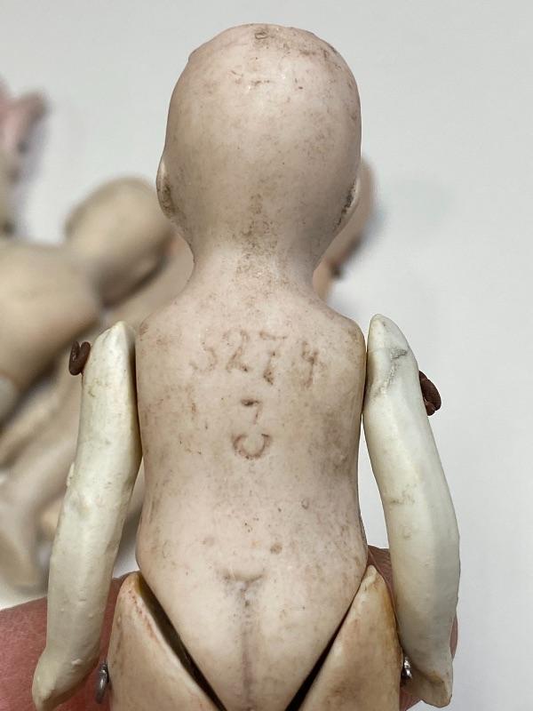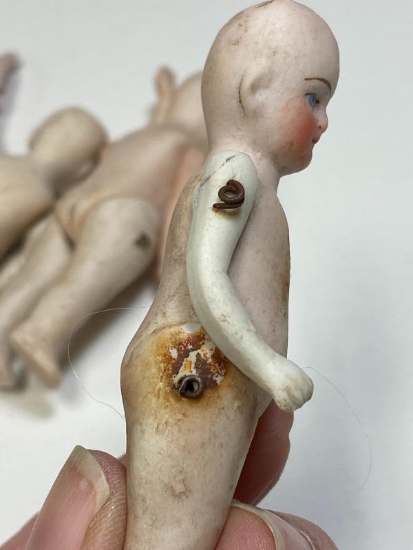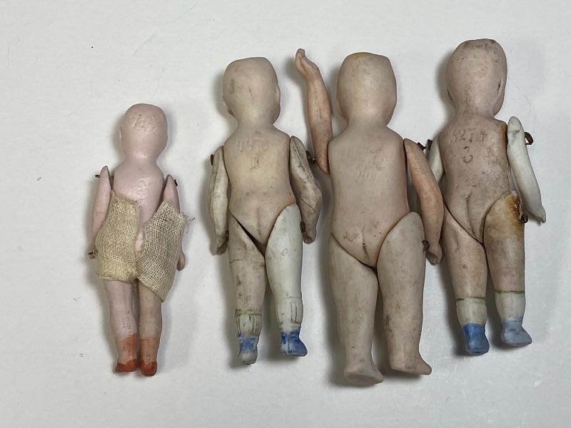 Set of 4 antique bisque dollhouse dolls. Jointed limbs. Various size. 3 have painted socks and shoes. The smallest is marked Germany while others have numbers only. Need to be cleaned a little . Some have limbs that are lighter in color then the bodies, maybe fade or replaced body parts. 3.5" and smaller.