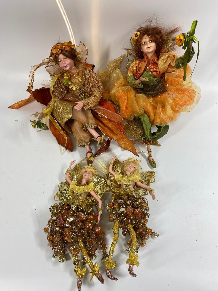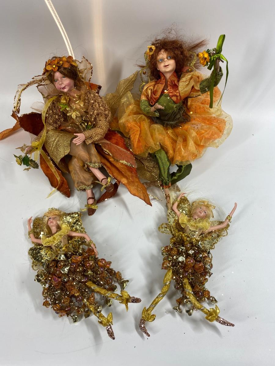 Set of 4 Autumn Fall Themed Fairy Dolls. Two are small and identical, about half the size of the larger two. Bendable limbs. Good condition. Under 12" size.