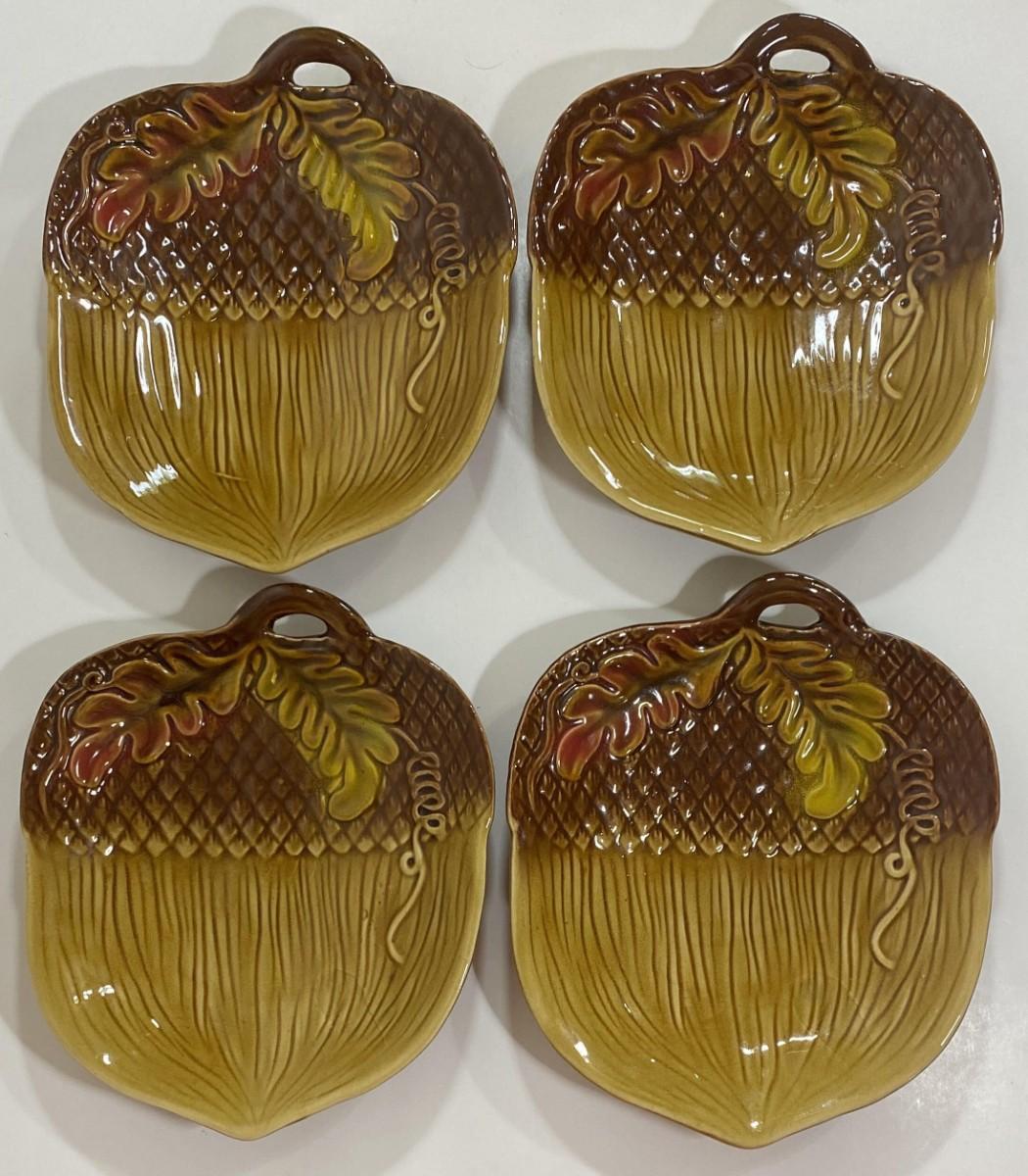 Set of 4 Brown Ceramic Acorn Shaped 7.25" X 6.25” Candy / Nut Dishes. Leaves