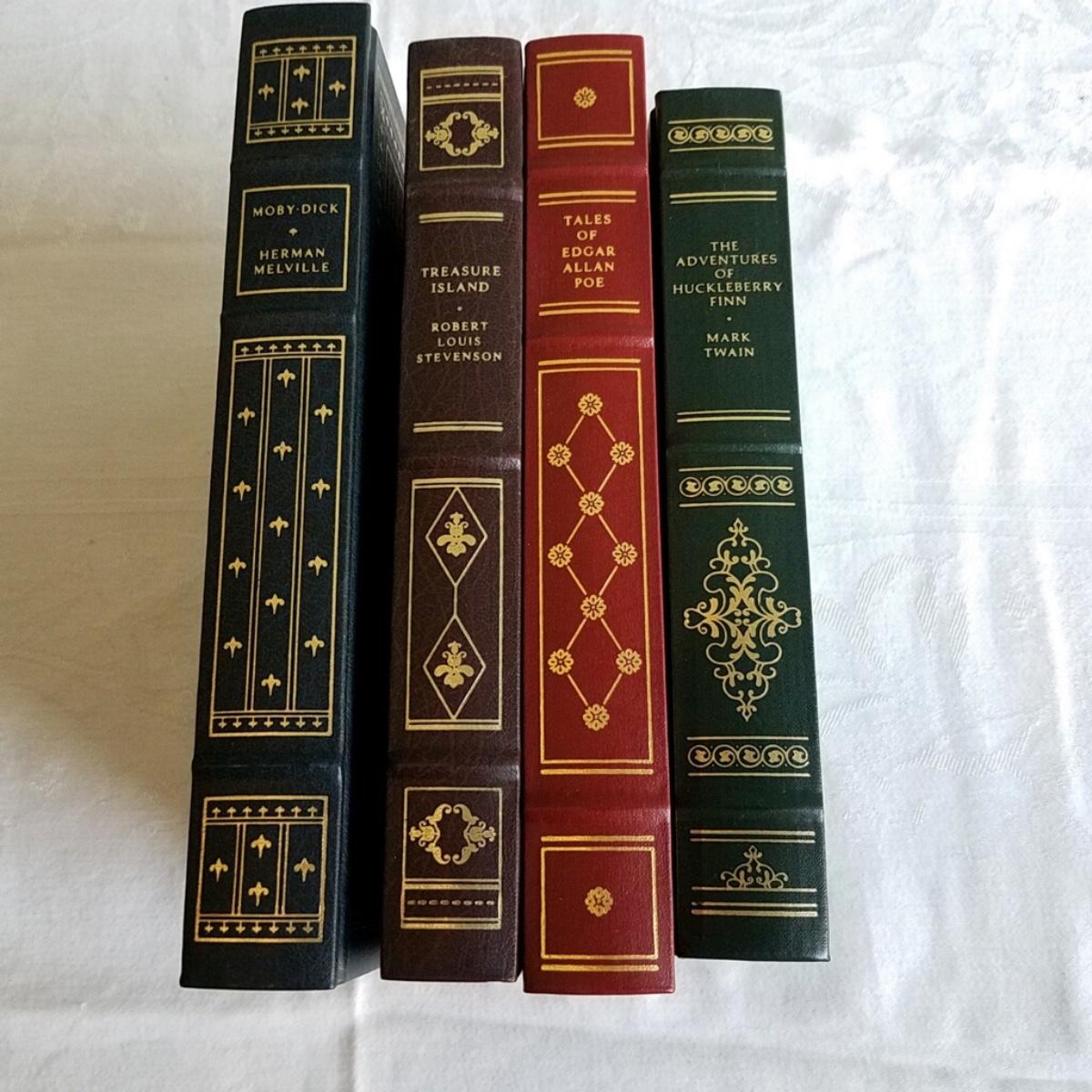 Set of 4 Classic books with gold leaf edges. “Moby Dick”, “Tales of Edgar Allen Poe”, “The Adventures of Huckleberry Finn”, “Treasure Island”. All in excellent condition.