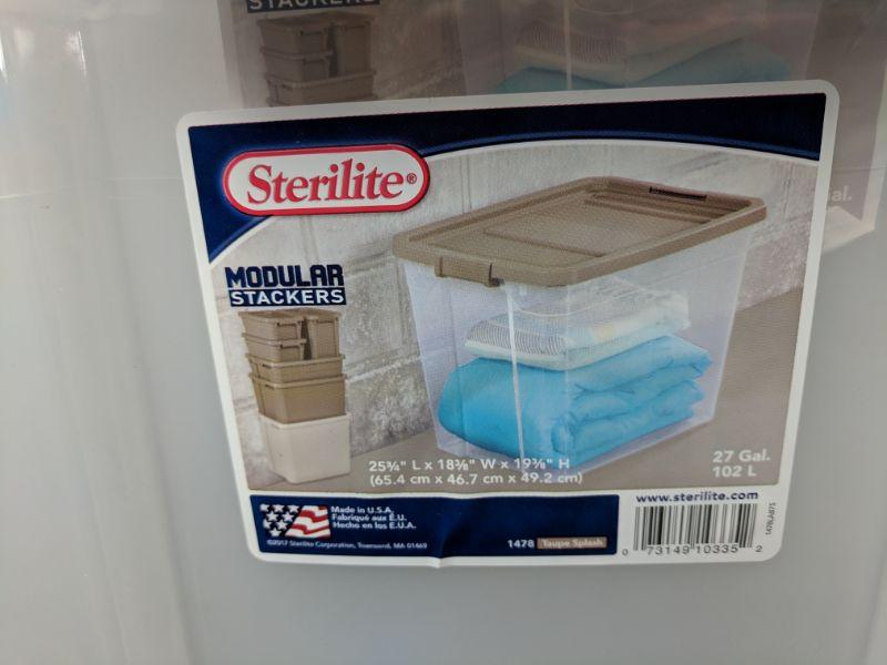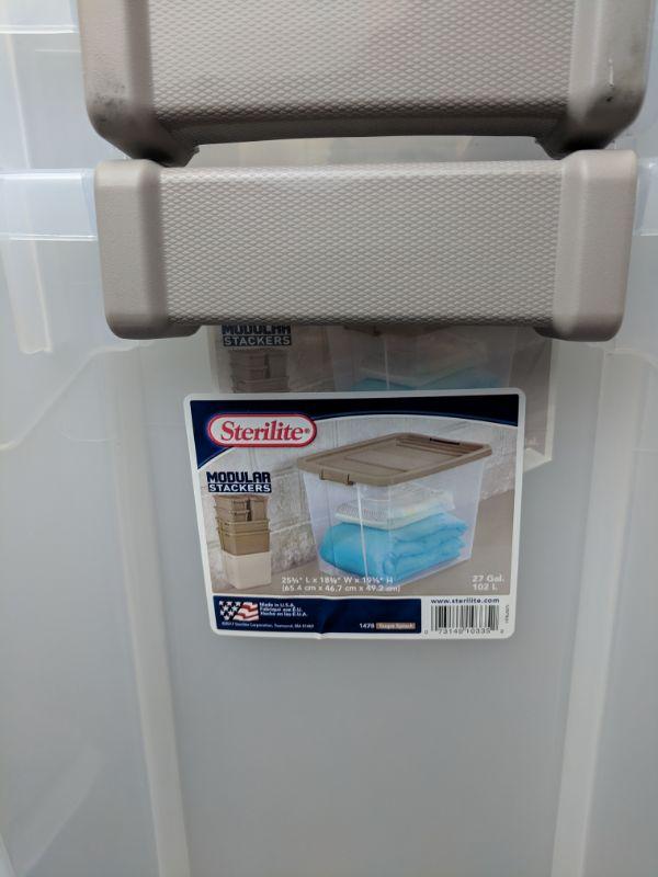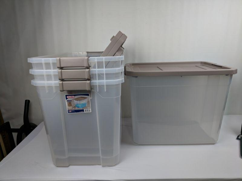 Set of 4 Clear Sterilite with Tan Lids, 27 Gal - New