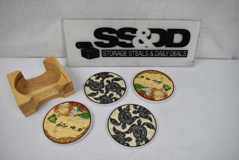 Set of 4 Coasters with Wooden Holder. No packaging - New