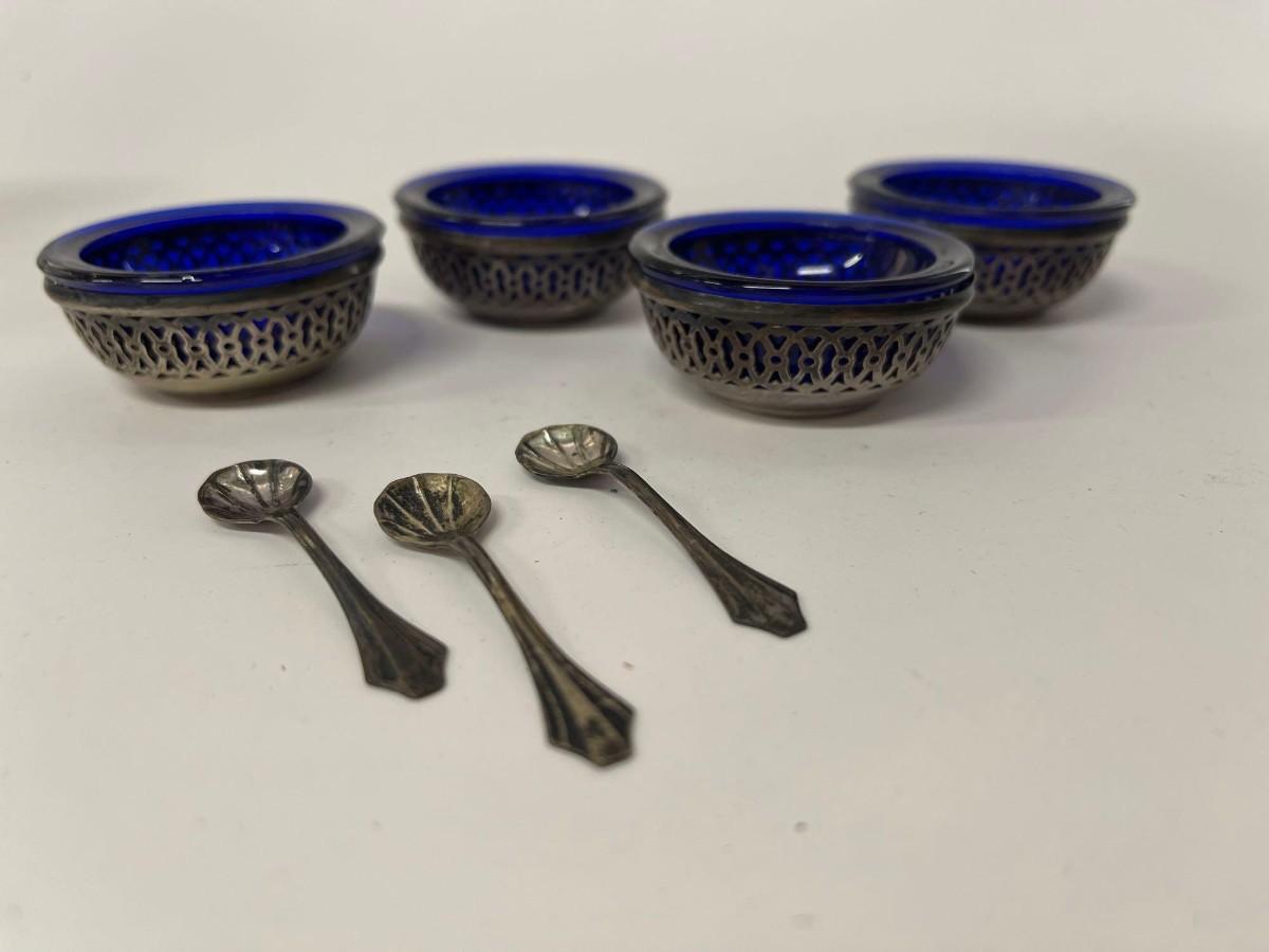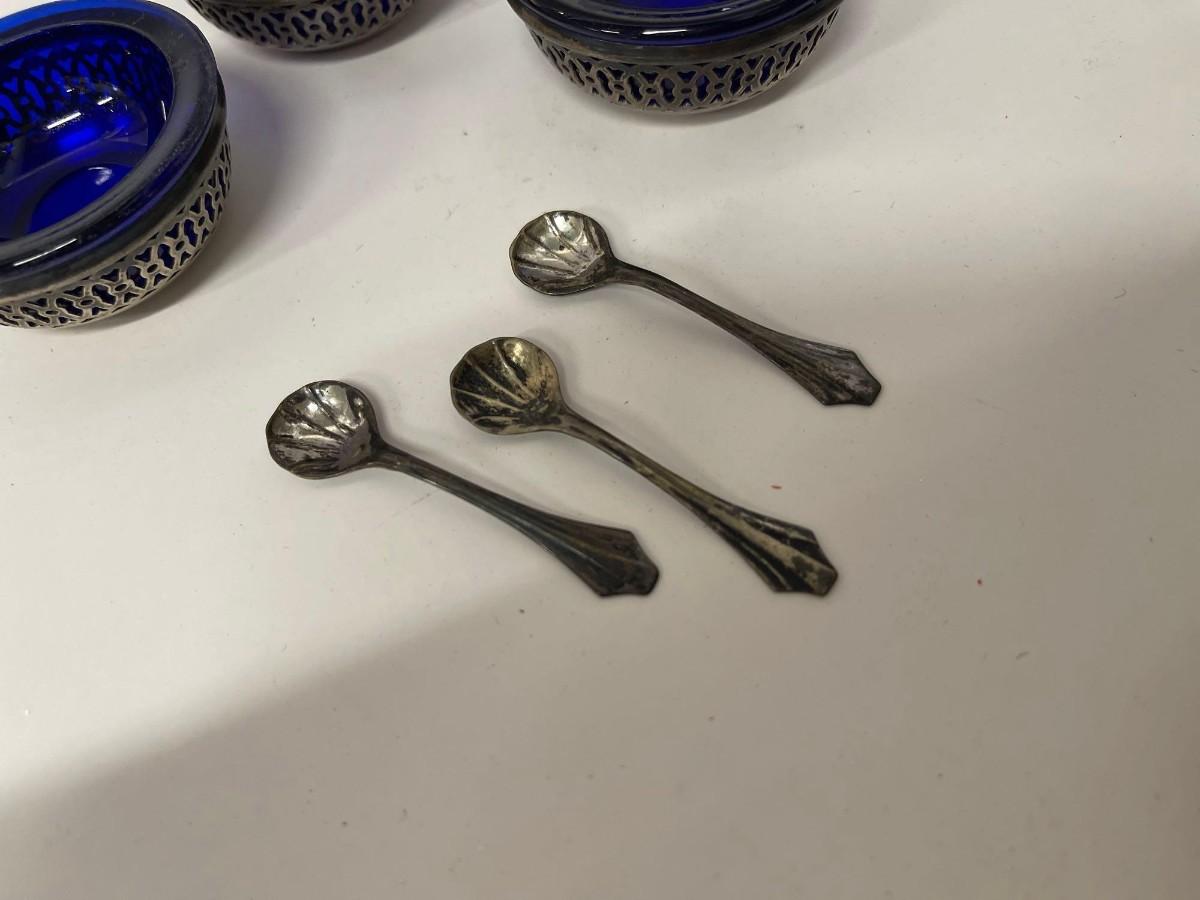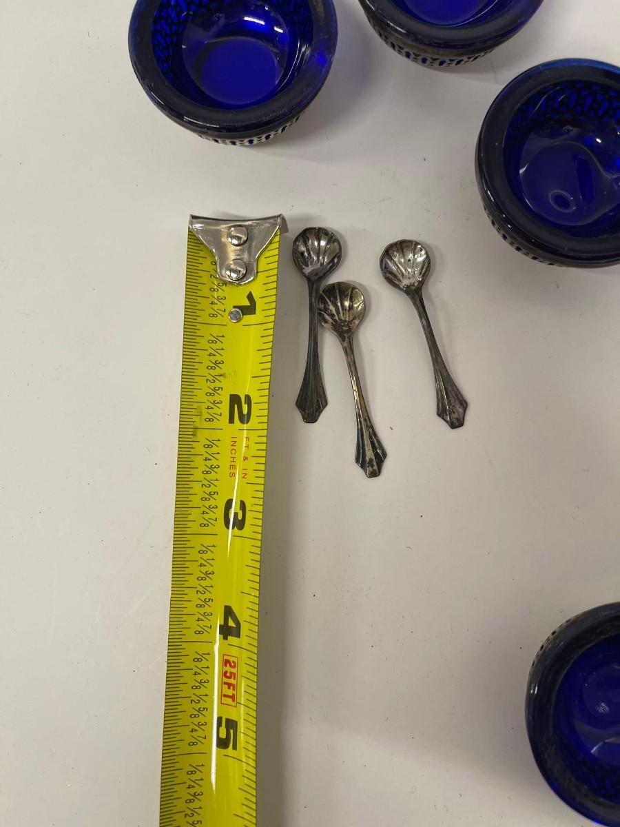 <p>Set of 4 Cobalt and Sterling Salt Cellars with 3 Spoons. Annoyingly one of the spoons is missing. All in excellent condition. </p>
