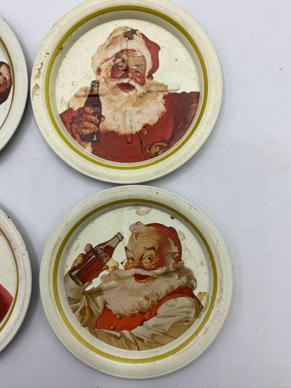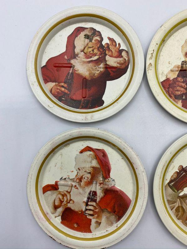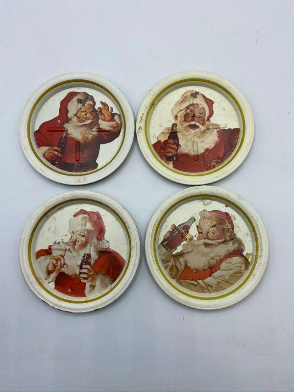 Set of 4 Coca Cola Santa Claus Coasters. Lightweight tin with different images. Previously used.