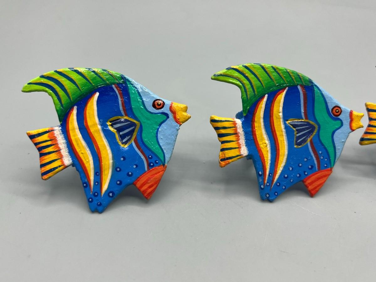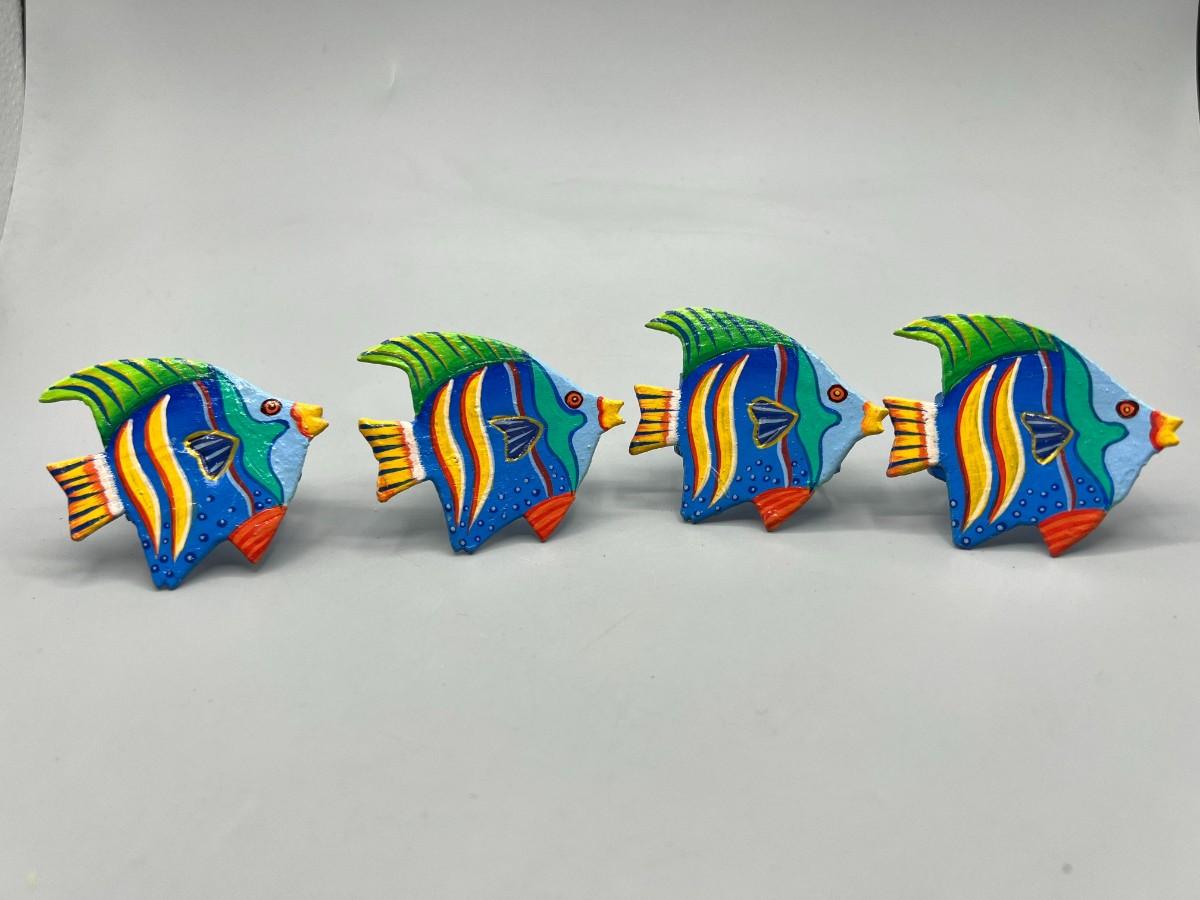 Set of 4 Colorful Painted Metal Art Tropical Fish Napkin Holder Rings. Matching set of cute tropical fish. Goos previously used condition.