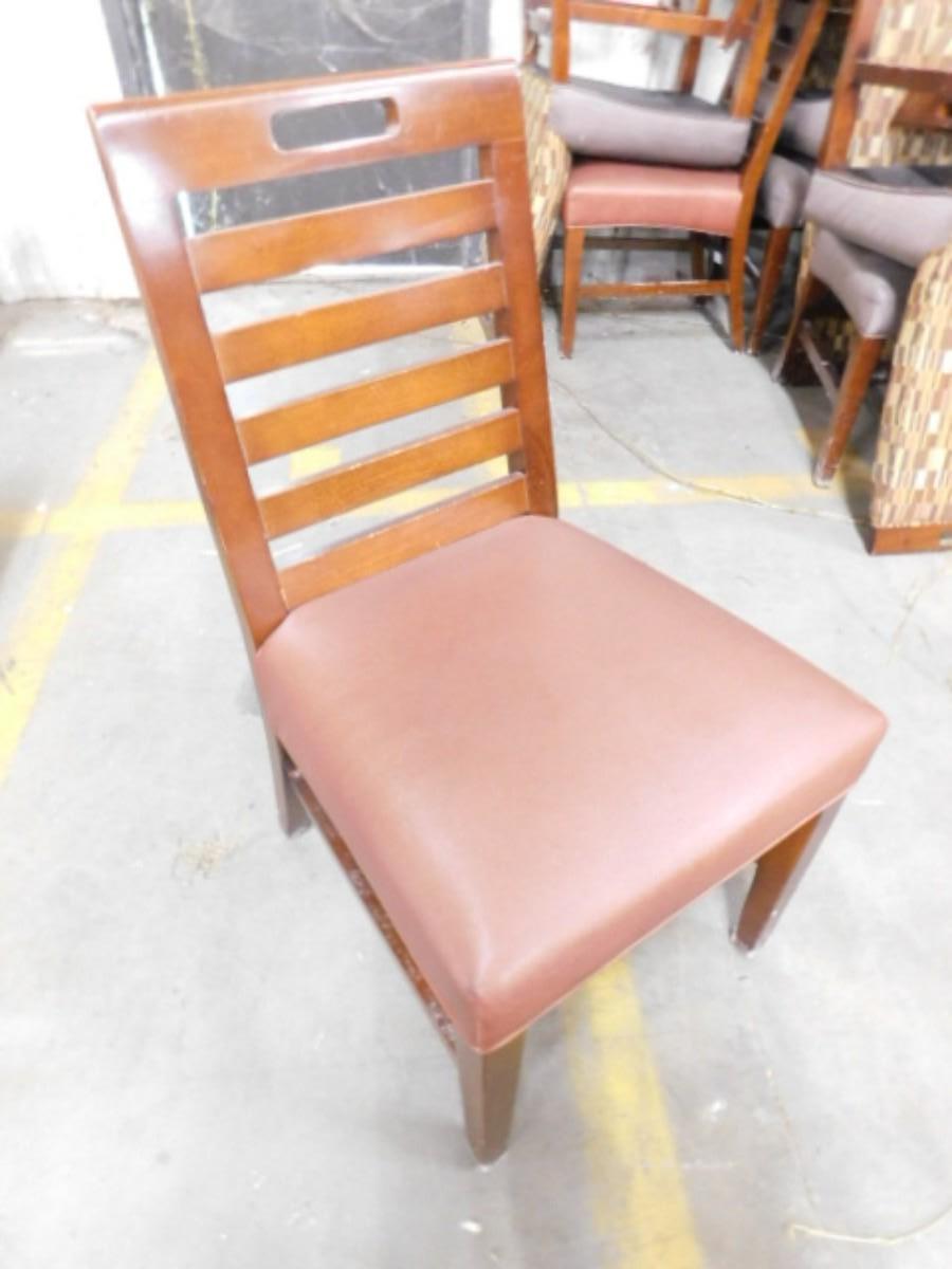 Set of 4 Commercial Grade Dining Chairs with Mauve Vinyl Covered Seats and Wood Slat Back Choice A may have scratches or wear