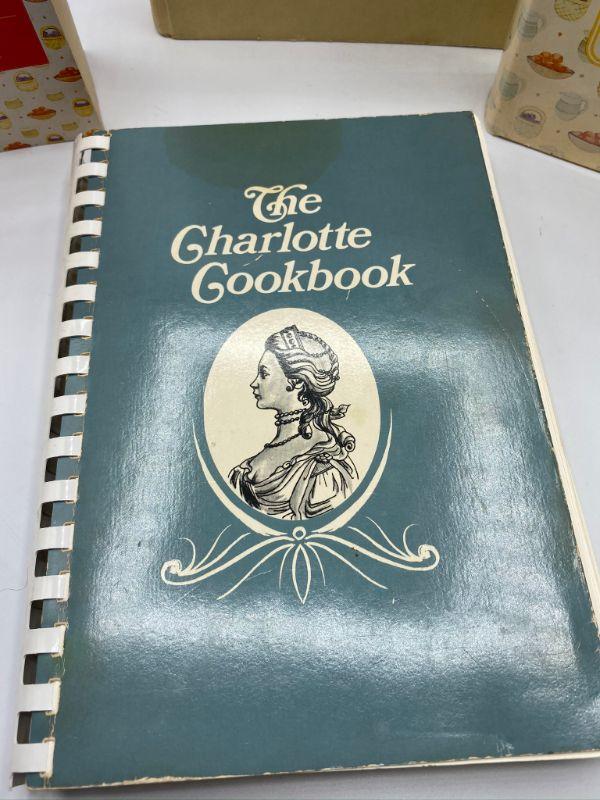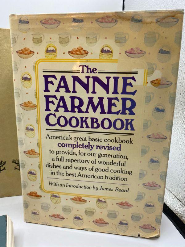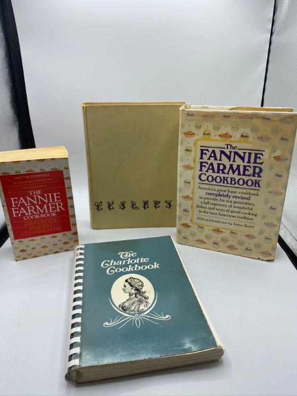 Set of 4 great cook books. Two are Fannie Farmer, one hardback and one pocket size. The Charlotte Cookbook and The Settlement Cook Book are the others. Good previously owned condition.