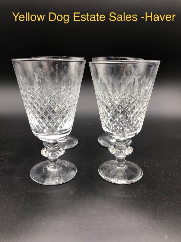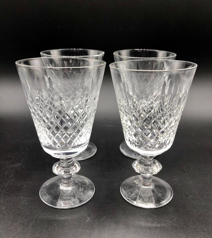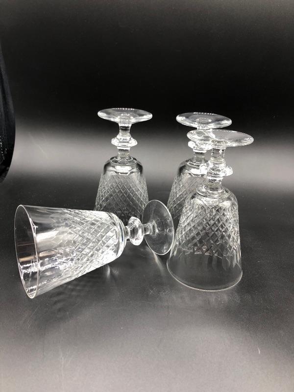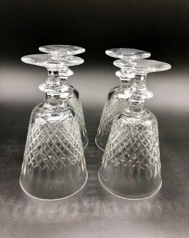 Set of 4 cut crystal glasses. Diamond & arrow pattern cut crystal. Good condition, one has a rough edge on the rim.