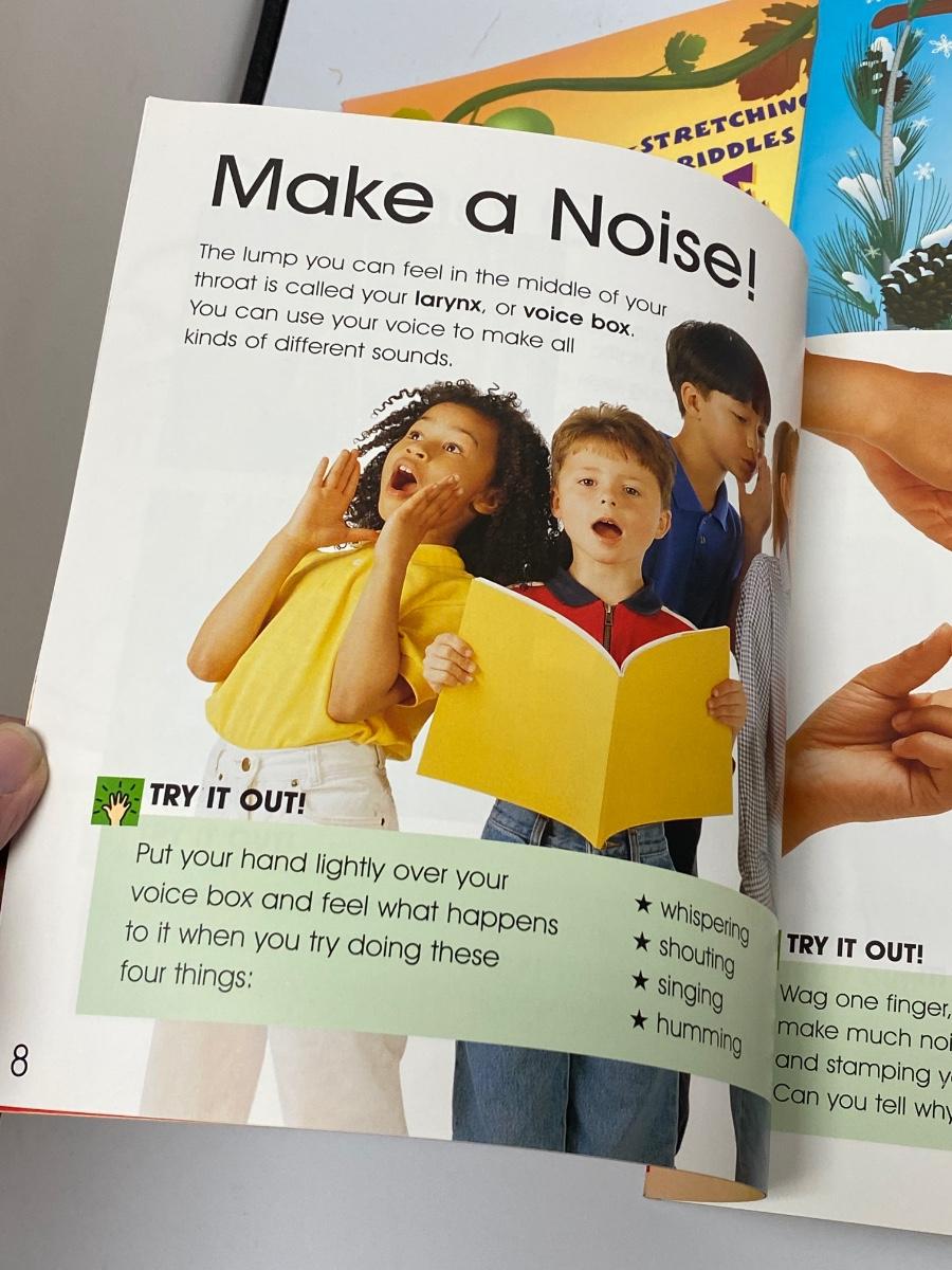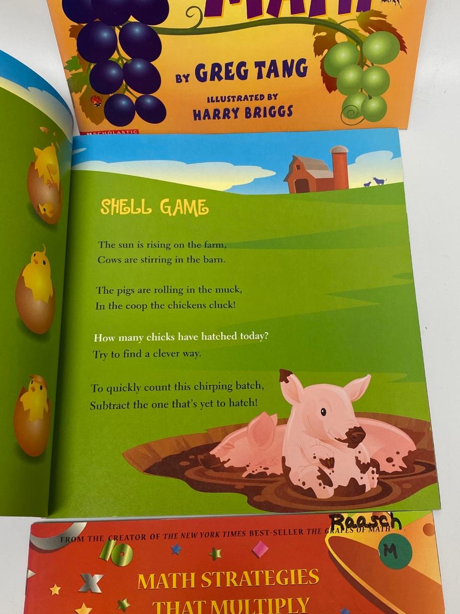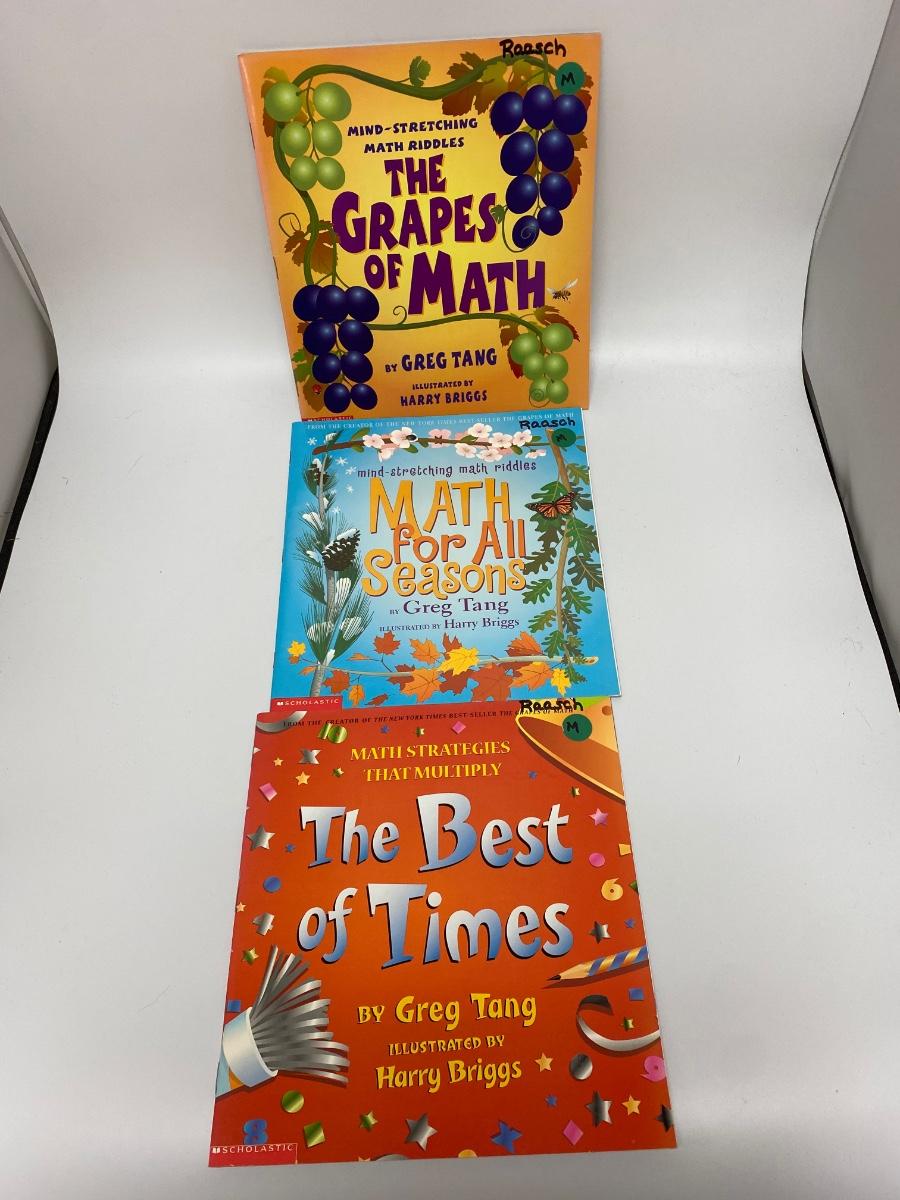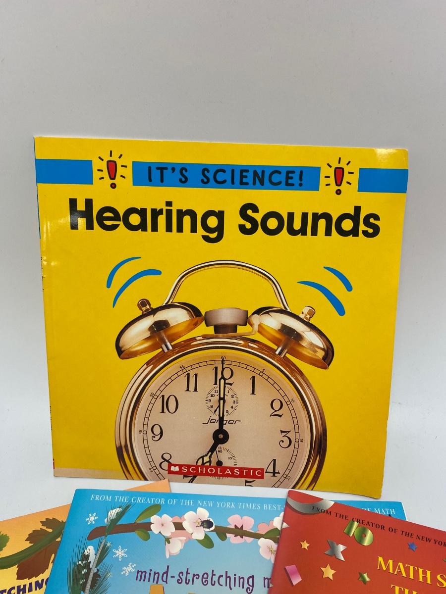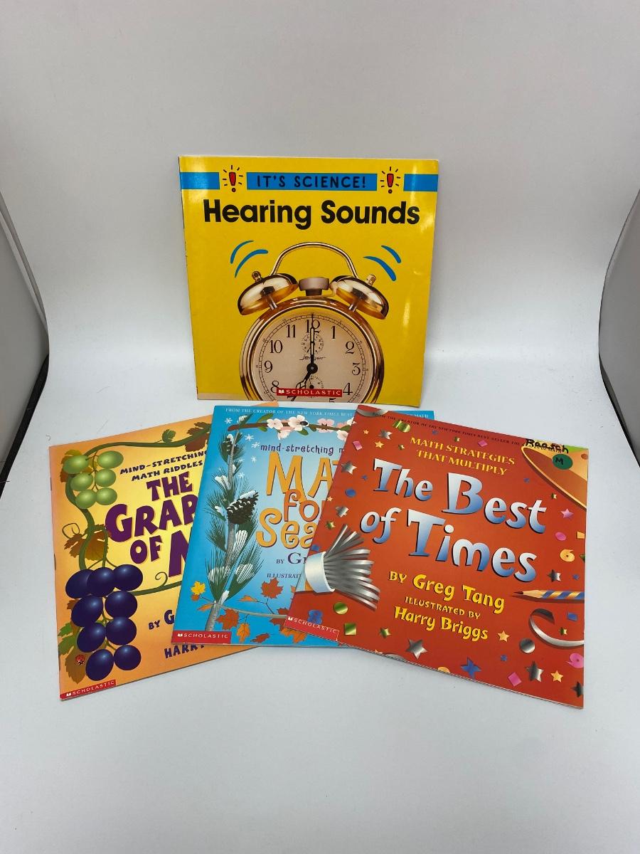 Set of 4 educational children's books. Science and math related. Hearing Sounds, and The Grapes of Math series of books. All are in good condition. Good for 3 grade and lower.