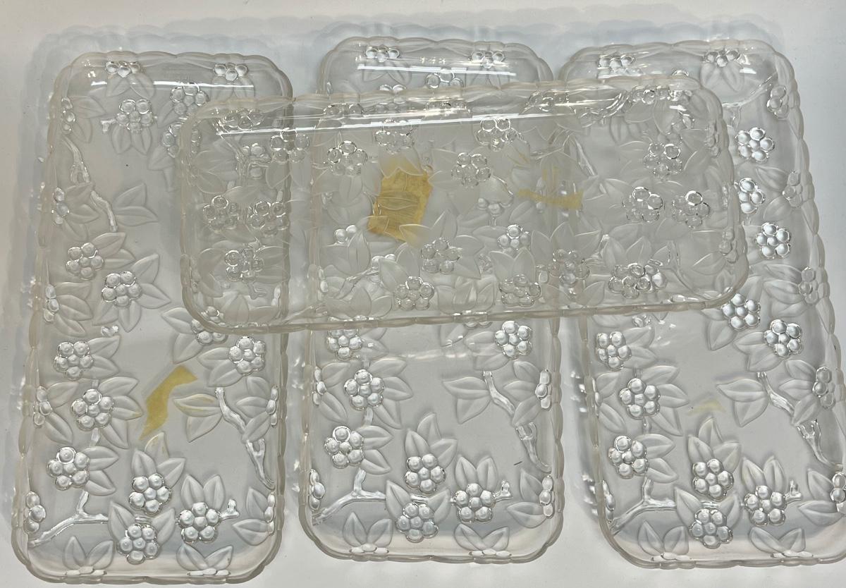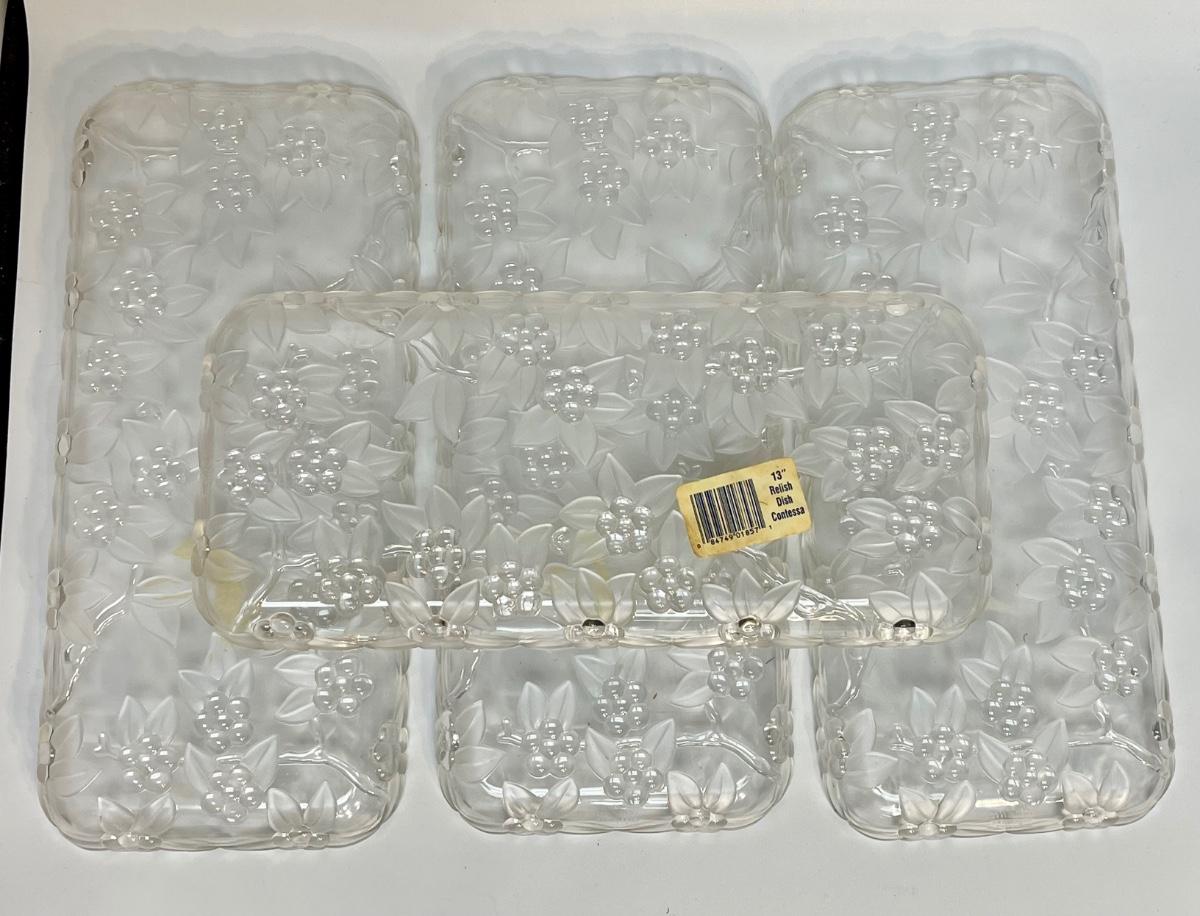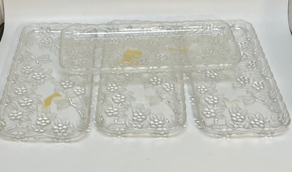 Set of 4 plastic serving trays. Embossed flower pattern, rectangle shape. Light discolor from age but in useable condition.