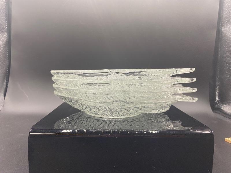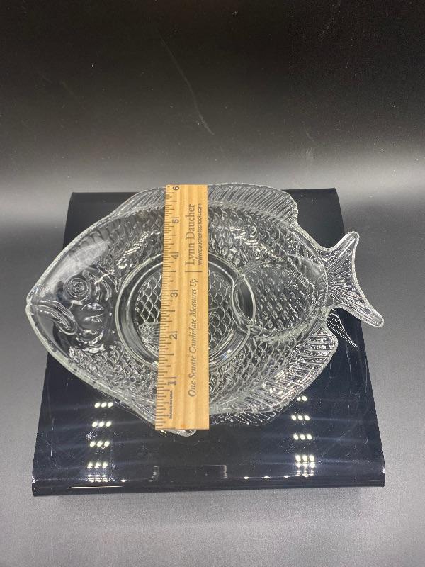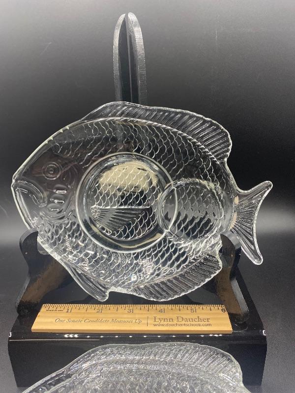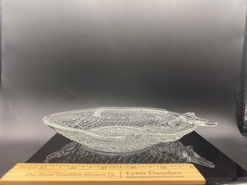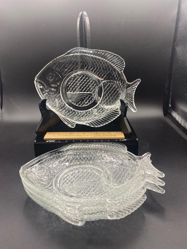 Set of 4 Fish shaped luncheon plates. Plates only. Clear glass. About 8" in length. Good Condition.