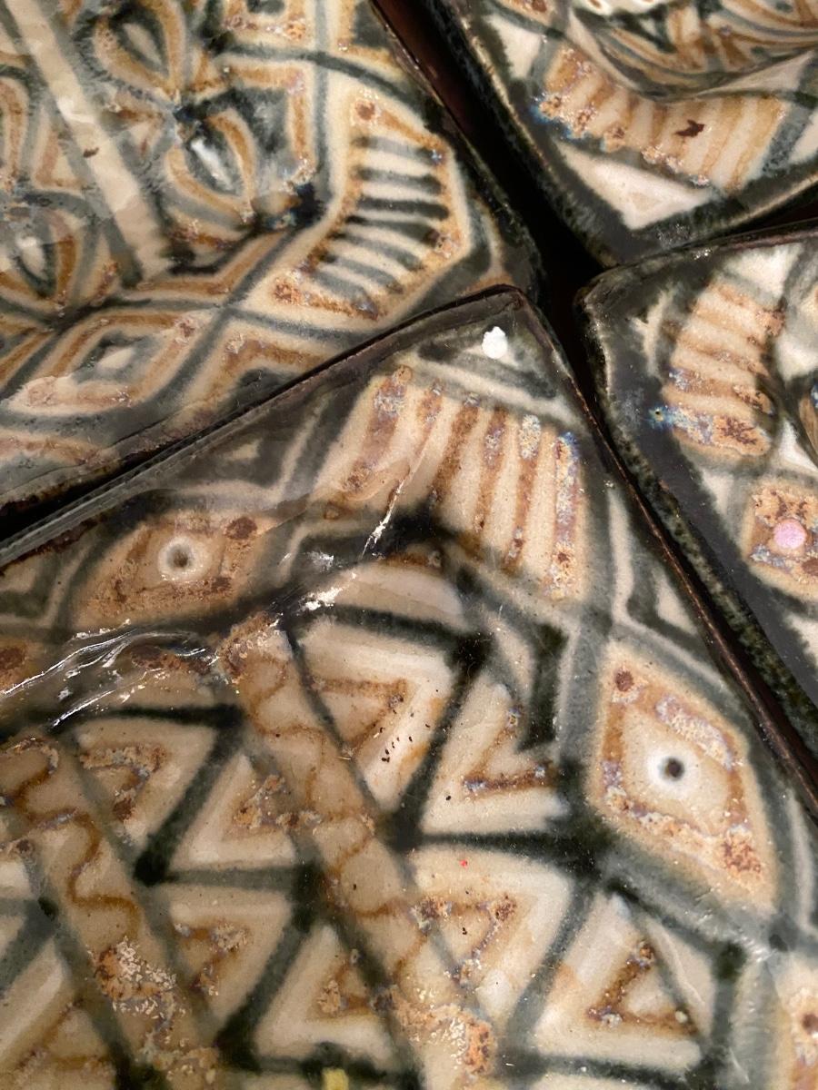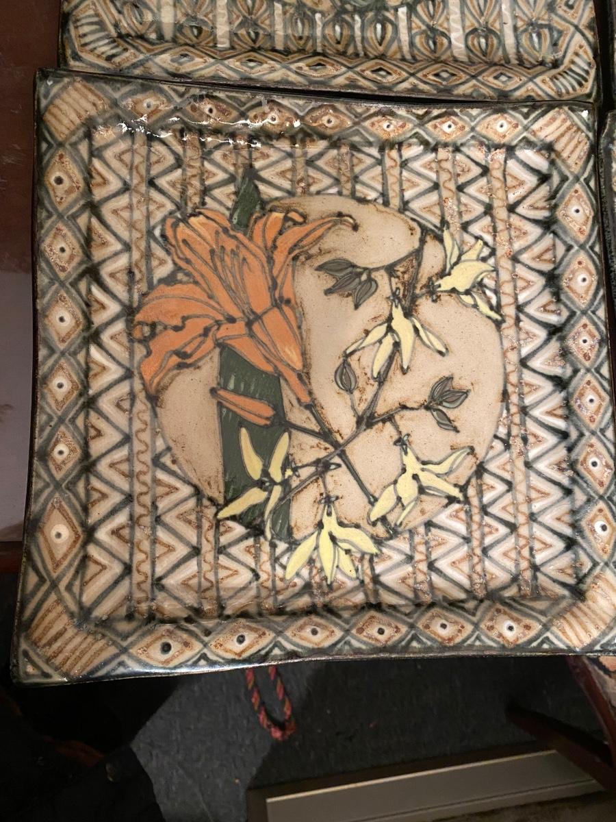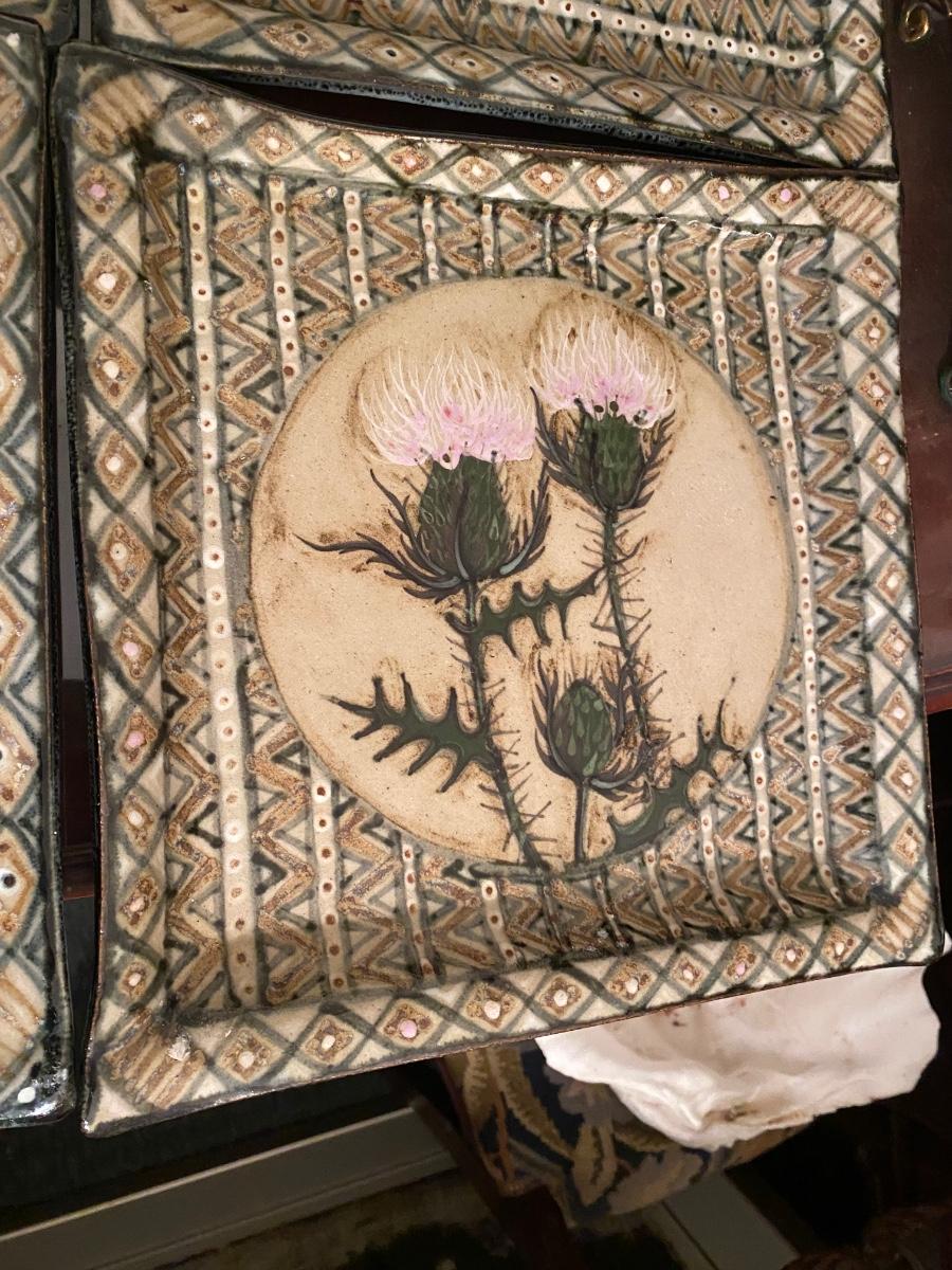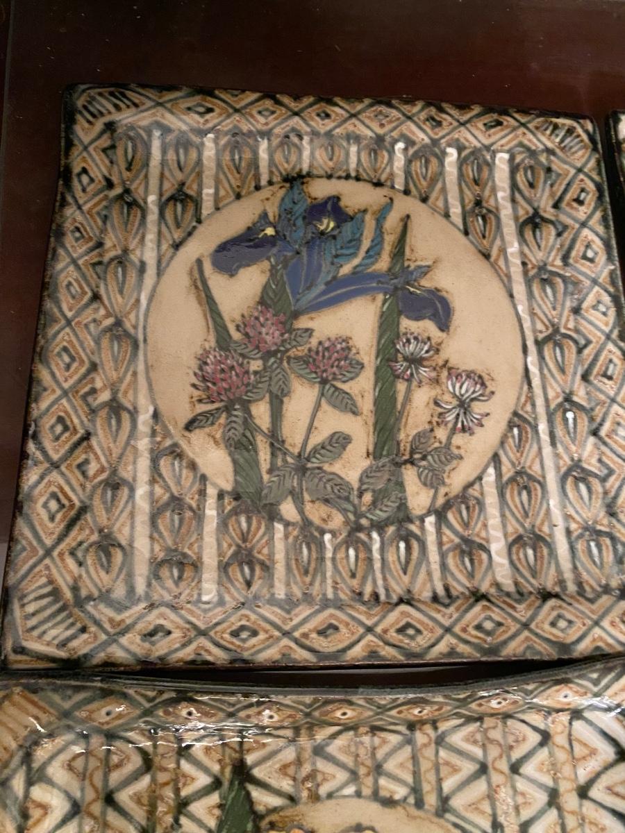 Beautiful set of 4 10" square art plates by ceramist Mary Vaughn BLake signed on the back. Amix of traditional and abstract bring a uniqueness to this grouping. One tiny chip on one plates. Would look amazing on any wall!