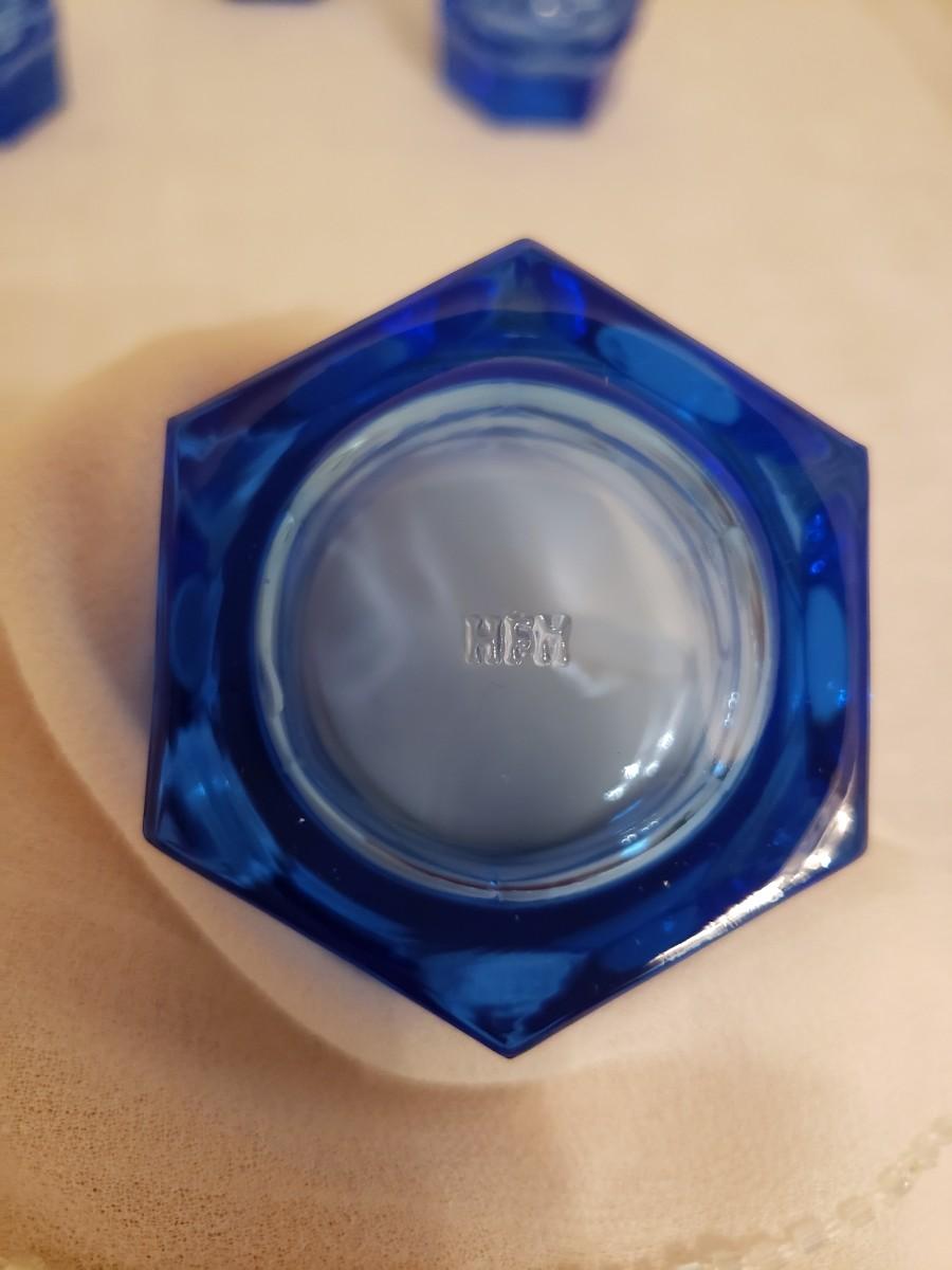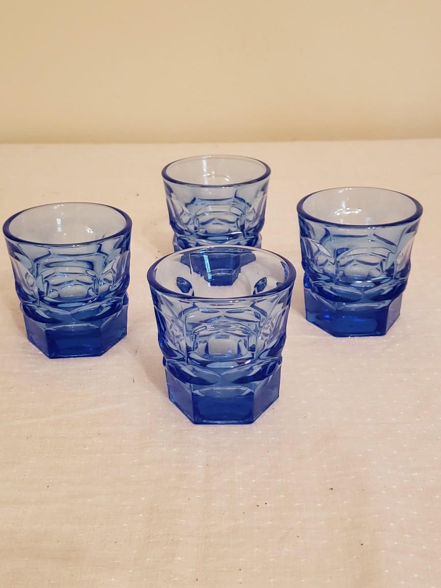 Set of 4 Fostoria Argus HFM Henry Ford Museum 3" tumblers. Colbolt blue. Excellent condition.
