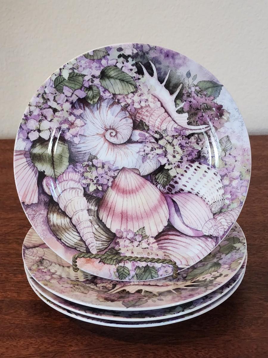 Set of 4 lovely seashell plates in soft muted purples and greens.