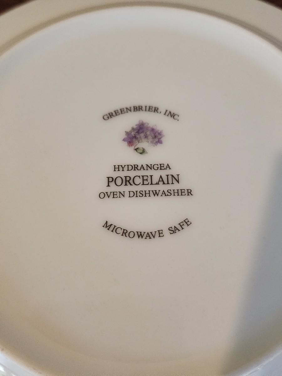 Greenbrier, Inc. Hydrangea pattern. Porcelain. Oven, dishwasher and microwave safe.