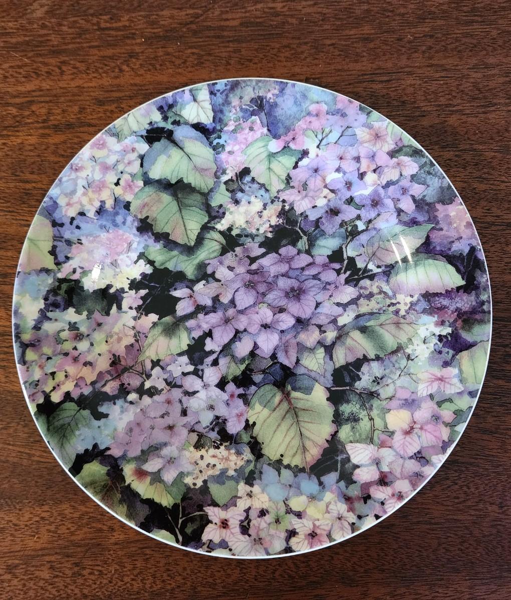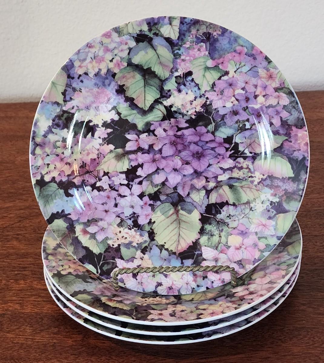 Set of 4 lovely hydrangia floral plates in soft muted purples and greens.