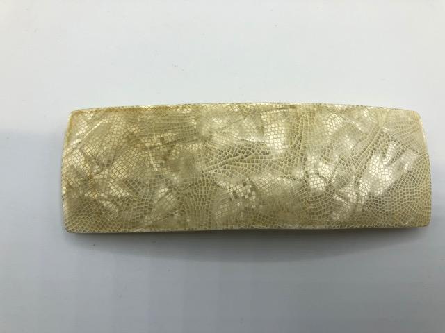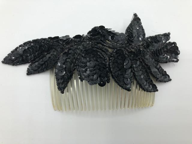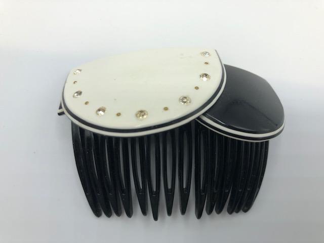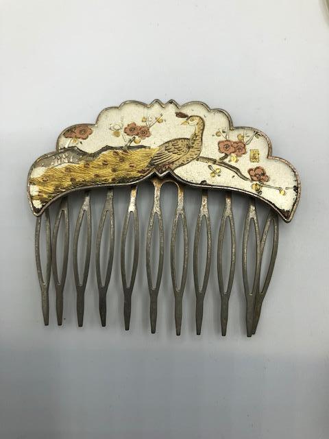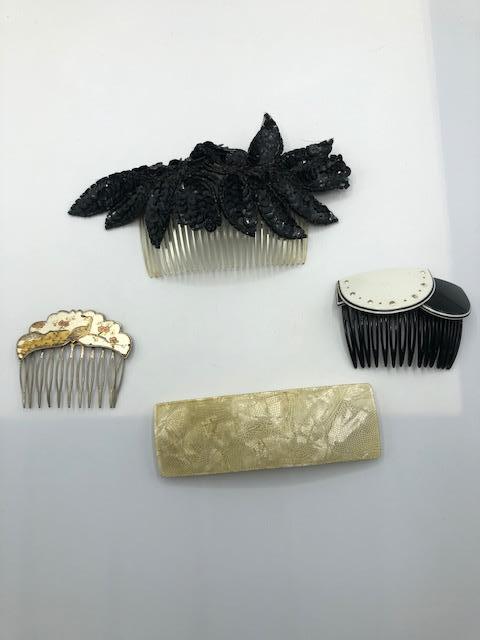 Set of 4 hair accessories. 3 combs and 1 clip. The one metal comb has an enamel image of a peacock. Previously owned, good condition.