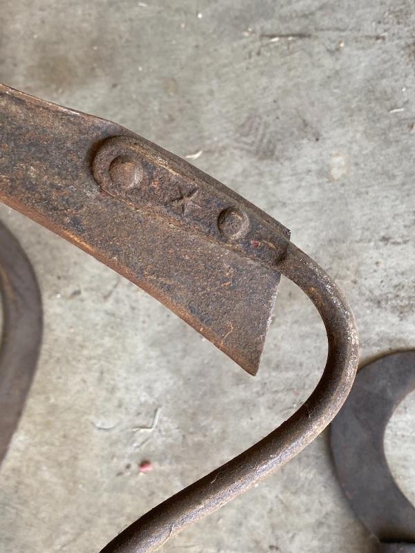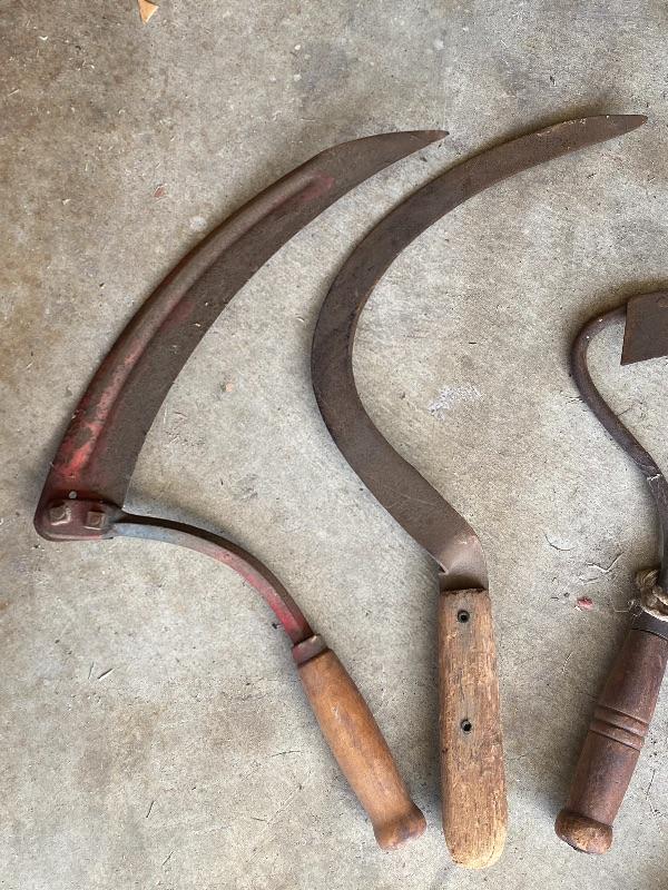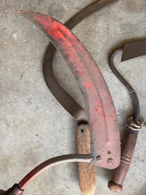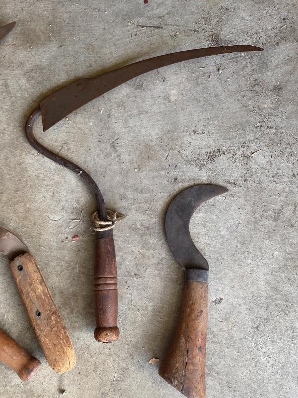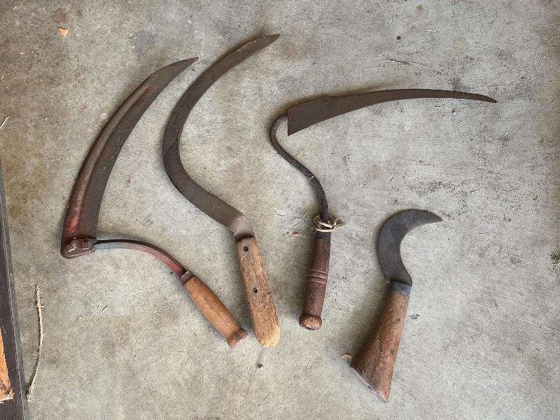 Set of 4 hand held sickles/scythes. Good vintage used conditions.