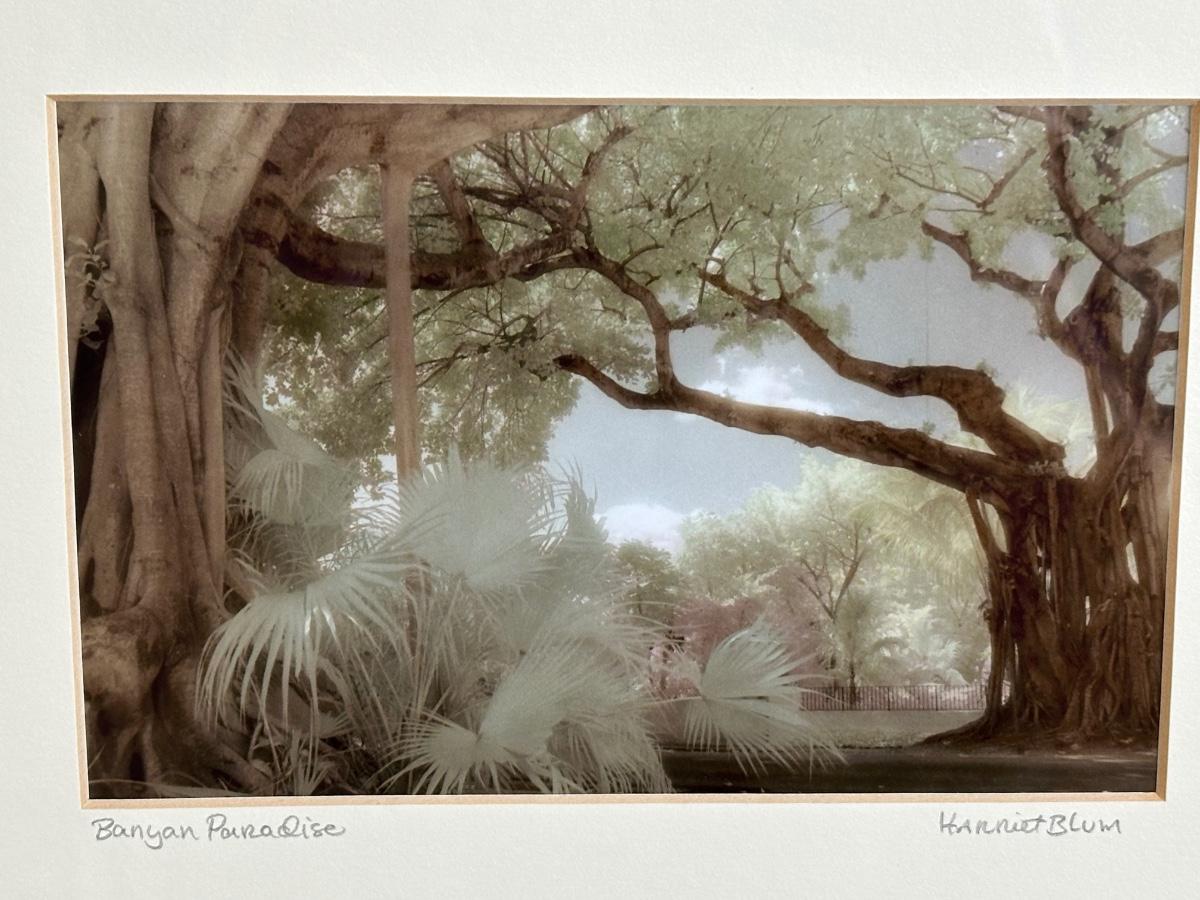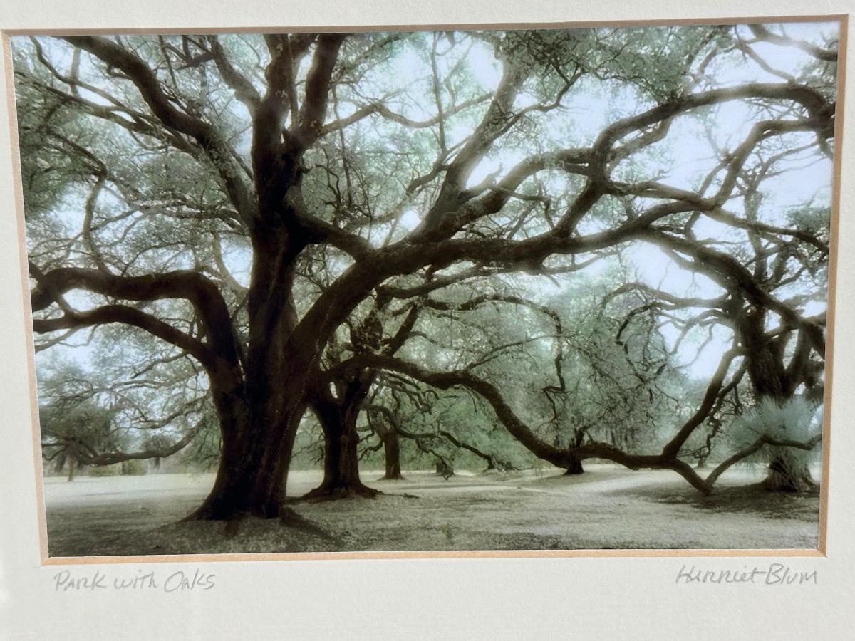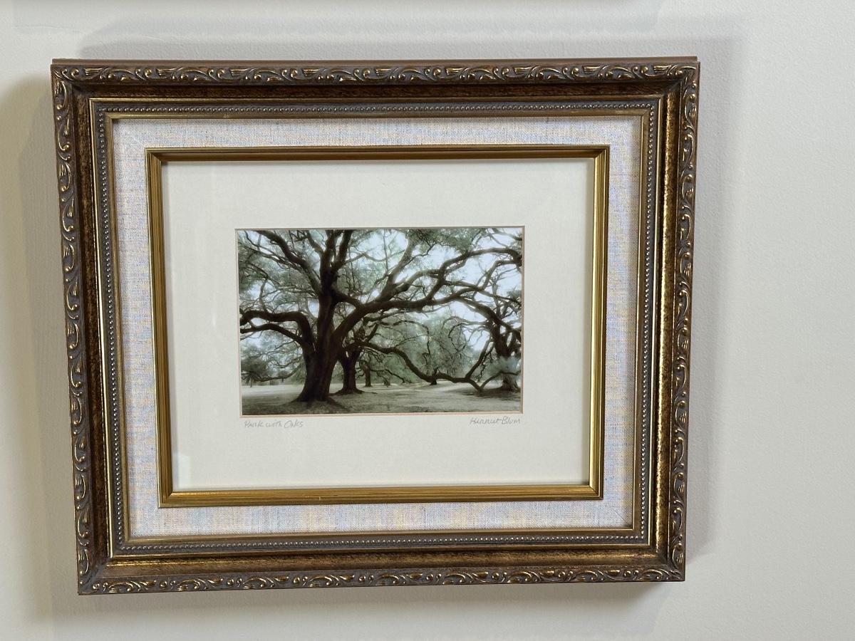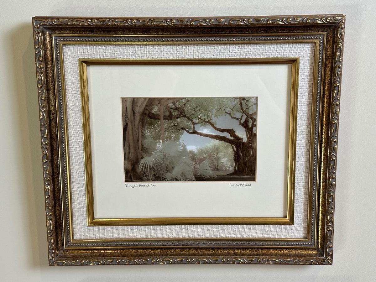 Titles include Fairchild Oak, Park with Oaks, April, and Banyan Paradise. All are signed by the artist and presented in matching double-matted frames with ornate gold accents.