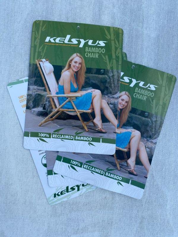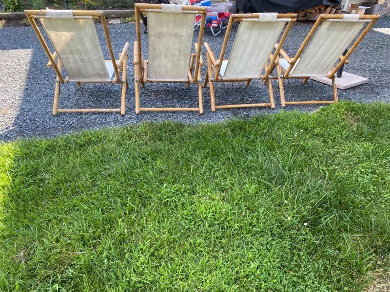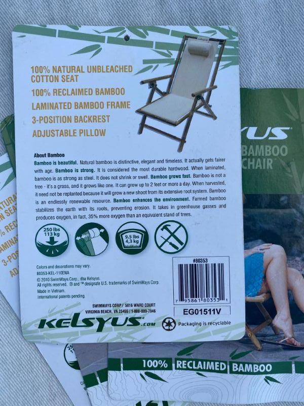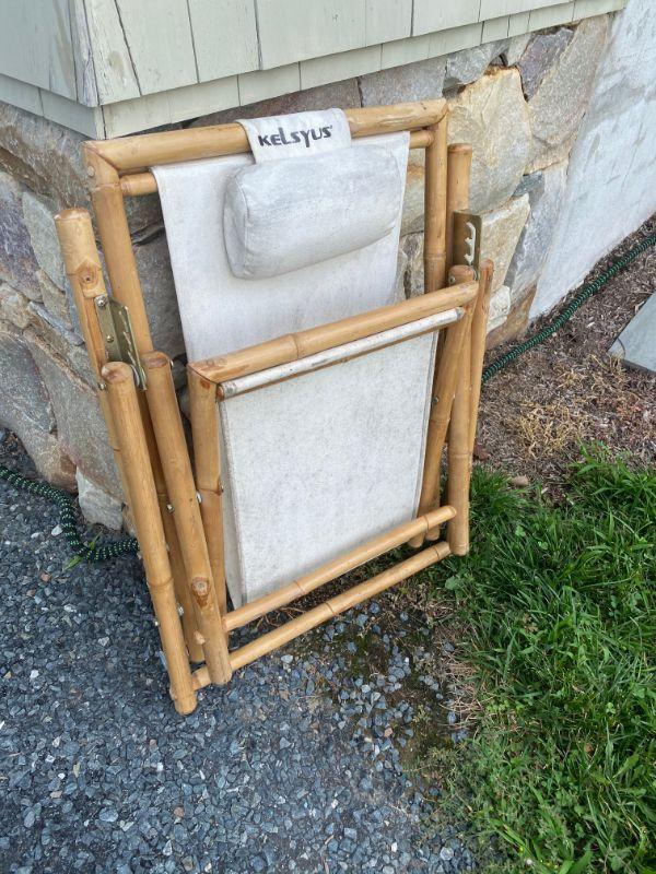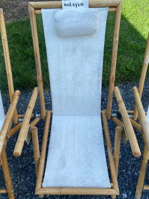 set of 4 Kelsyus 100% Reclaimed Bamboo Folding Chairs with 100% natural unbleached cotton seat. Has a 3 position backrest and adjustable pillow (some staining on cotton seat)