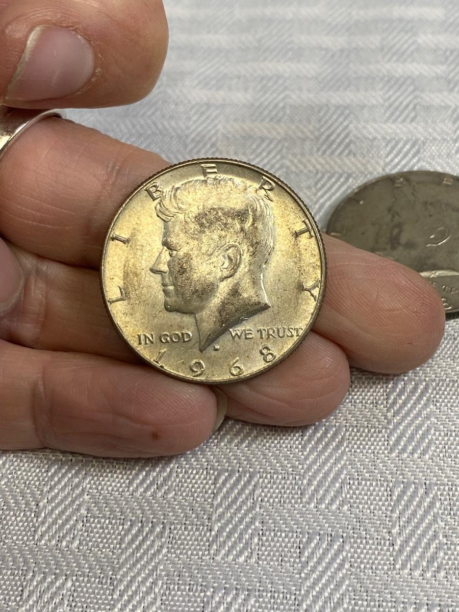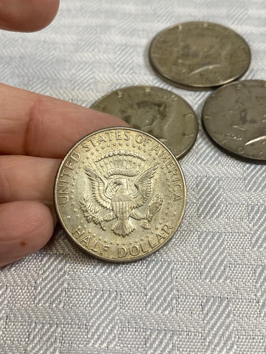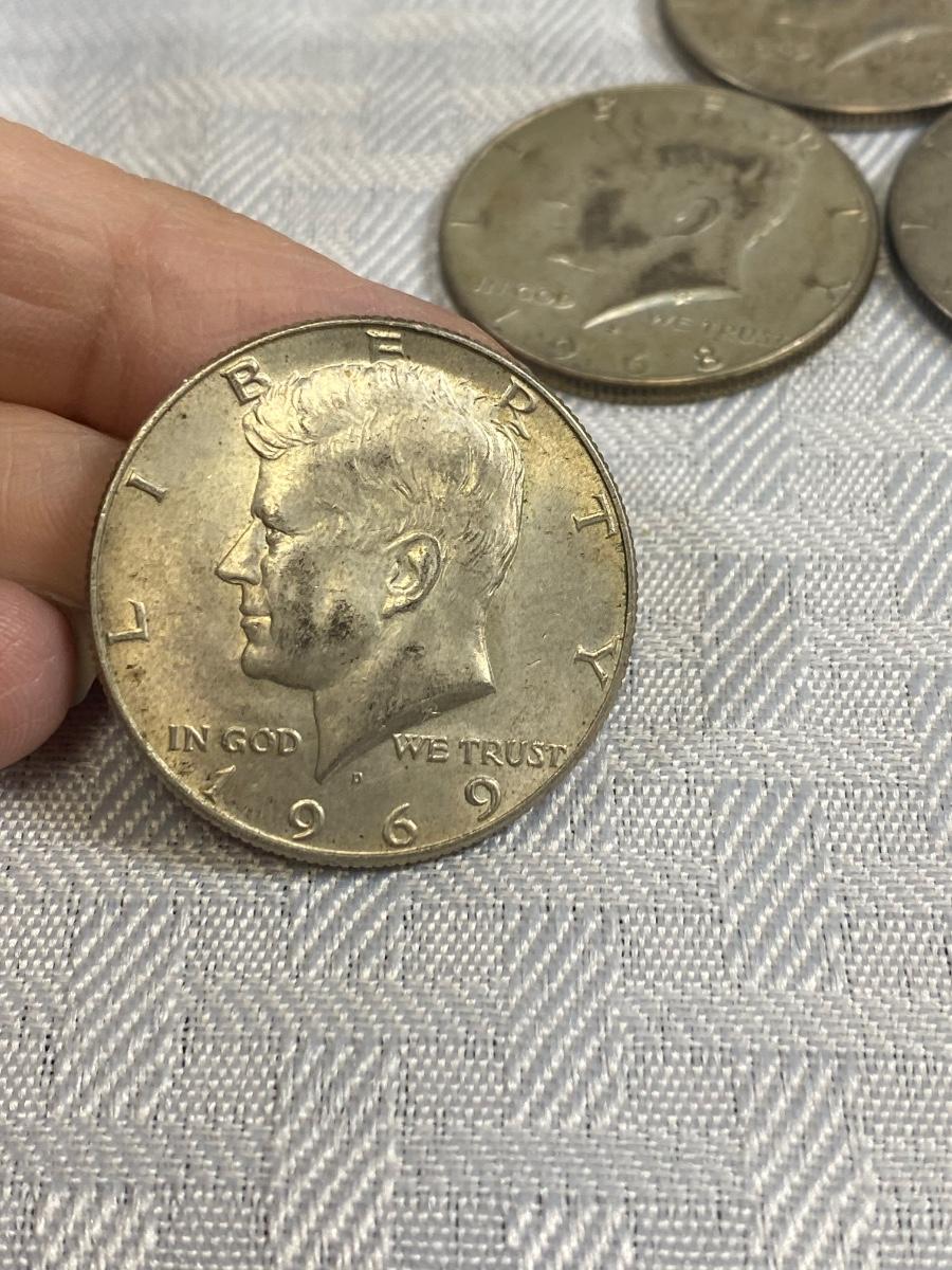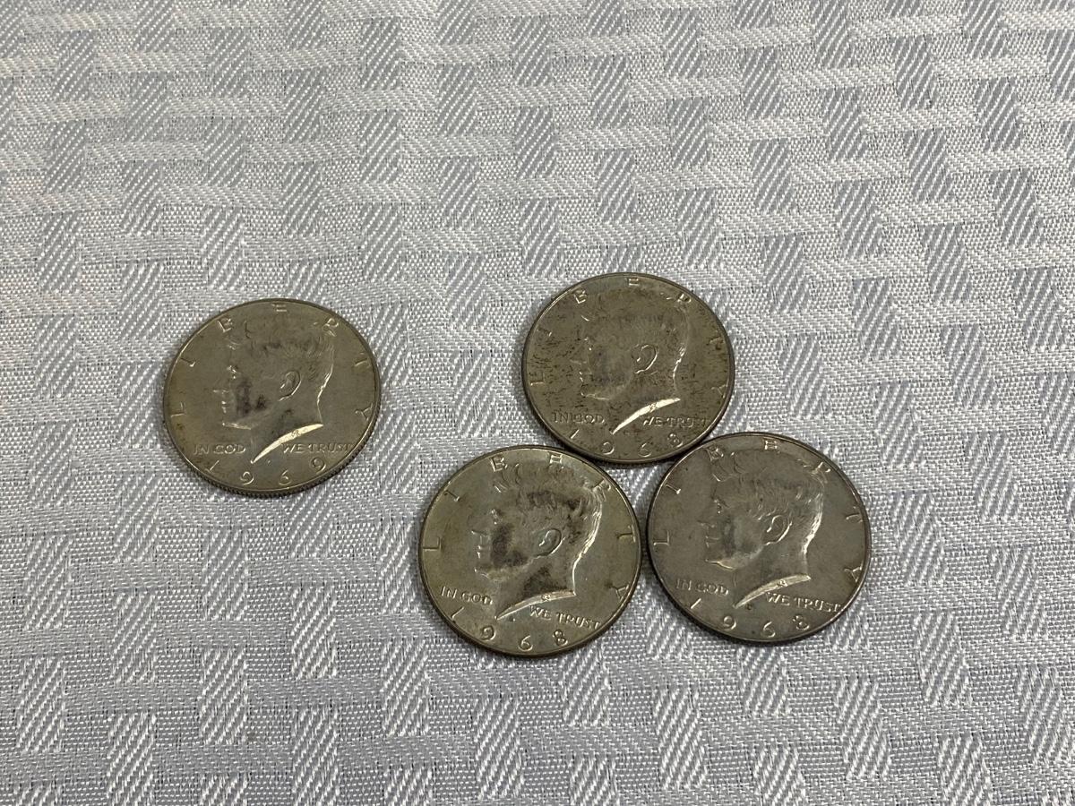 Set of 4 Kennedy Half Dollar 1969 1968 United States Coin Money. Discolor but in good, circulated condition, light wear.