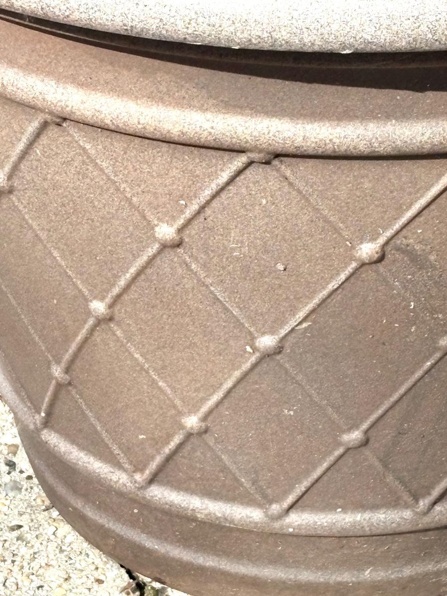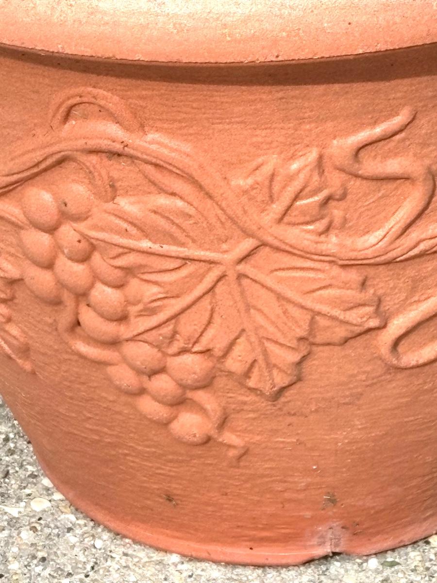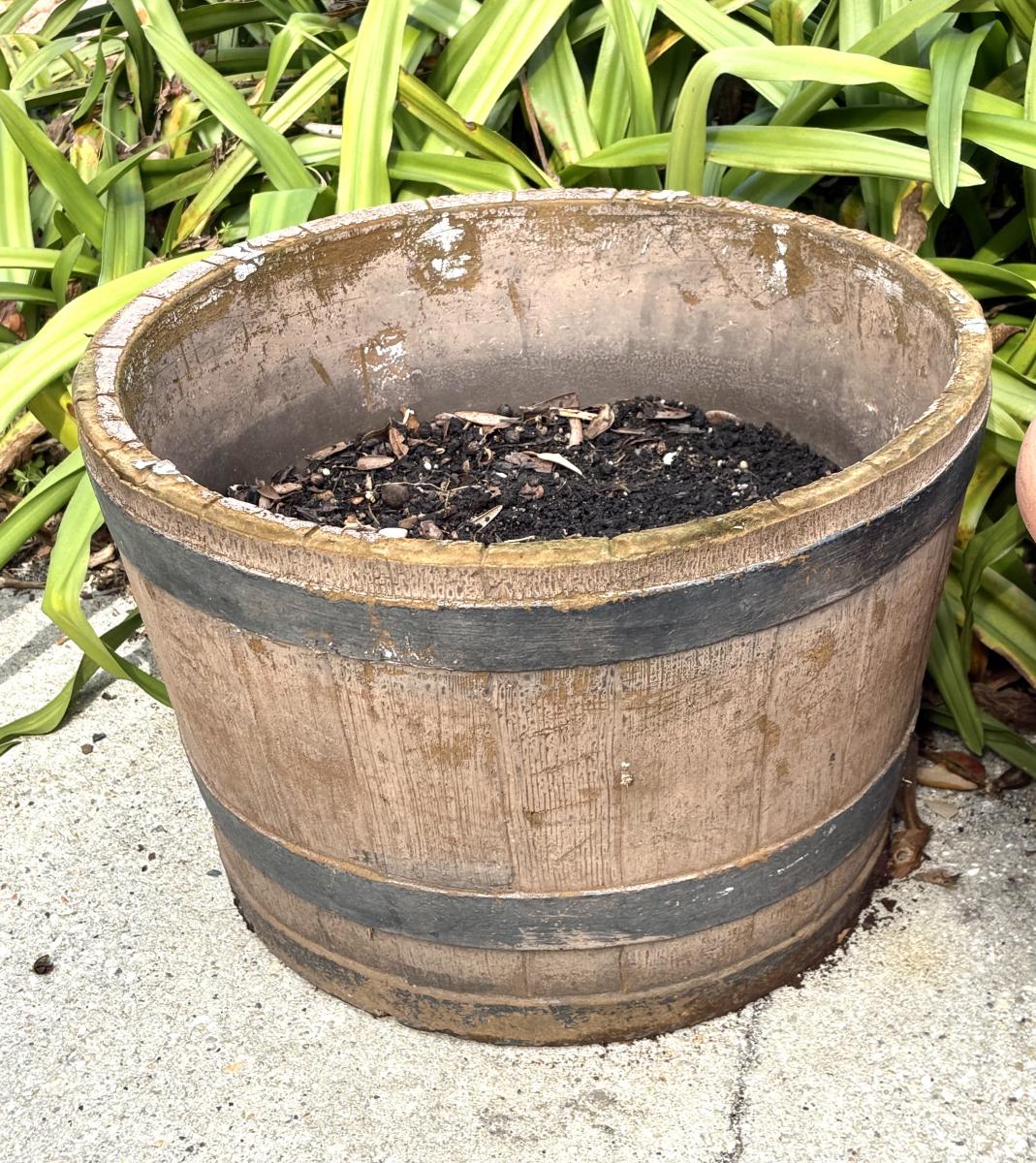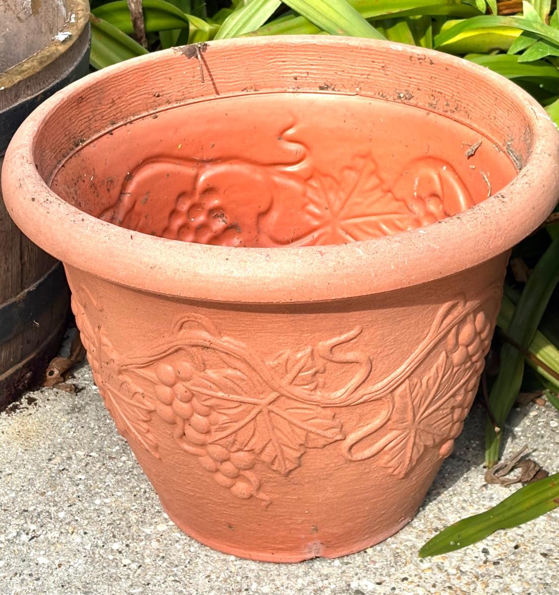 The cement flower pot is the second pot from the right. It is 16-1/4” tall x 12” diameter at the top. The wooden barrel shaped pot is 14” tall x 21-1/2” diameter at the top. Orange pot with grapes on the side is 13-3/4” tall x 17-1/2” diameter at top. The pot with the diamond pattern is 17-1/2” tall x 23-3/4” diameter at top.