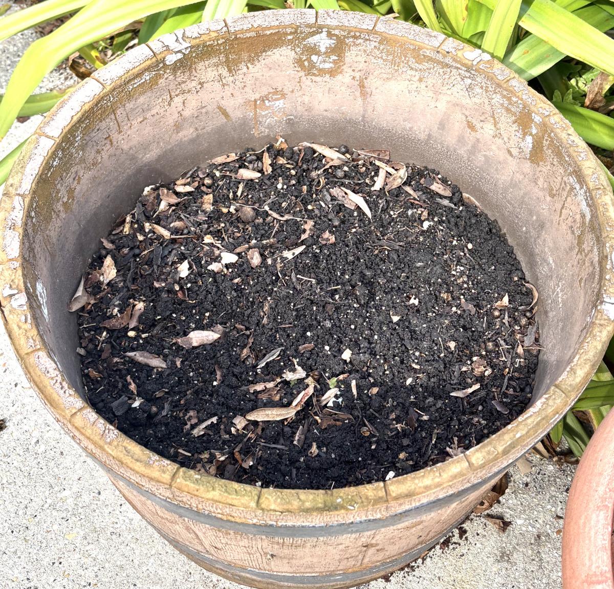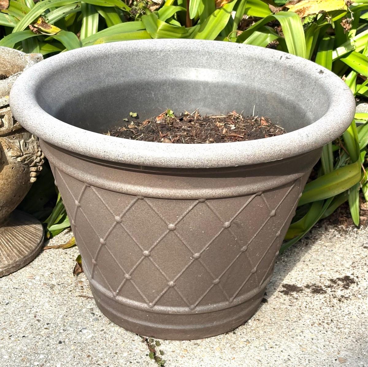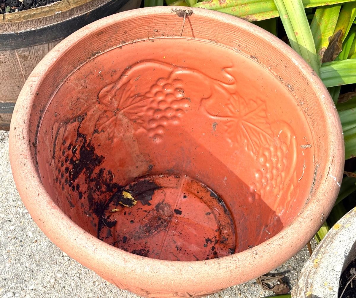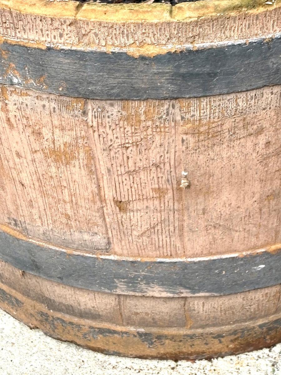 The cement flower pot is the second pot from the right. It is 16-1/4” tall x 12” diameter at the top. The wooden barrel shaped pot is 14” tall x 21-1/2” diameter at the top. Orange pot with grapes on the side is 13-3/4” tall x 17-1/2” diameter at top. The pot with the diamond pattern is 17-1/2” tall x 23-3/4” diameter at top.