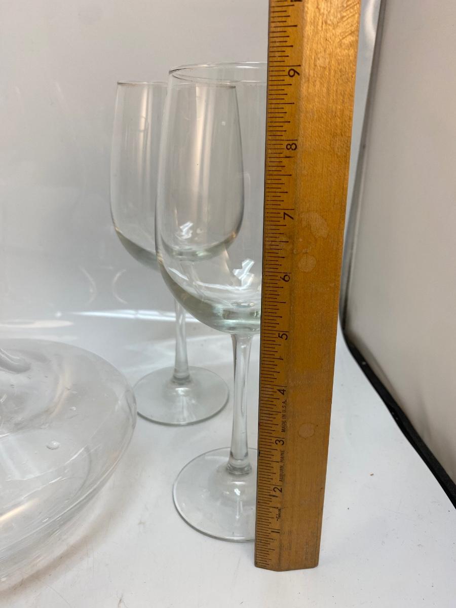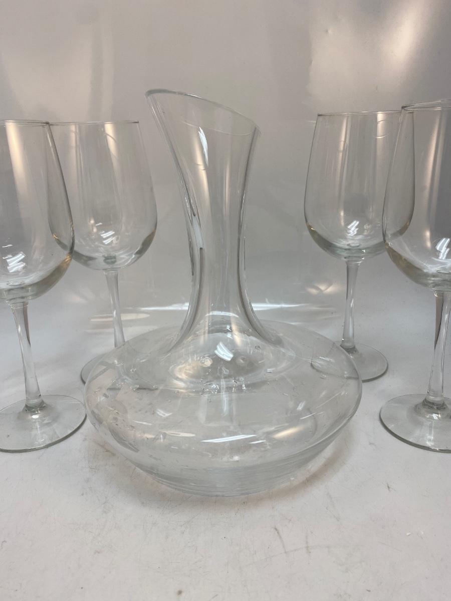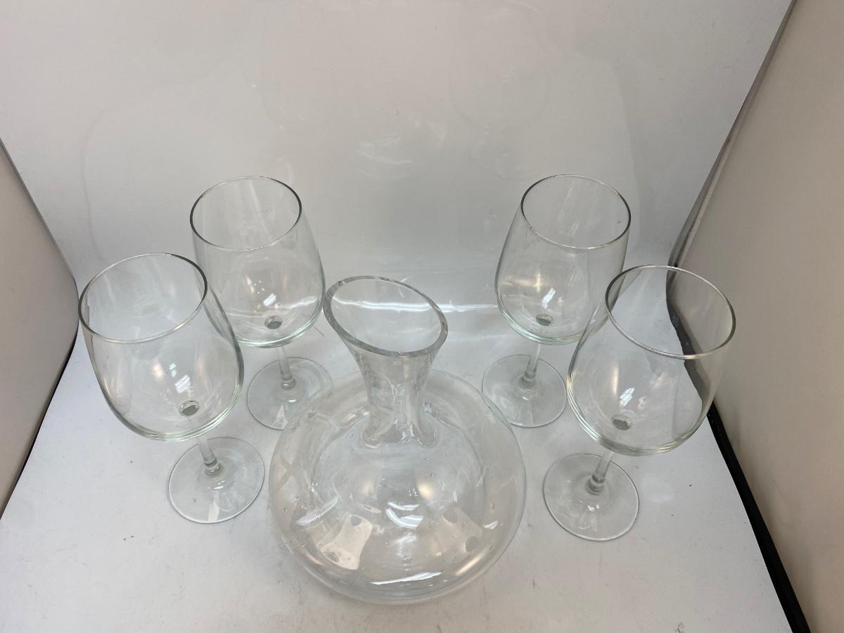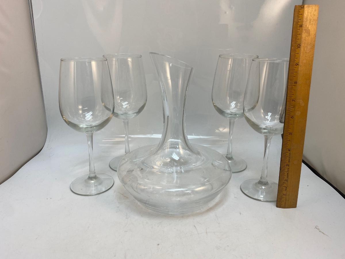 Set of 4 Large Wine Goblet Glasses with Decanter Bottle. in good condition. Nice sized goblets. No chips.