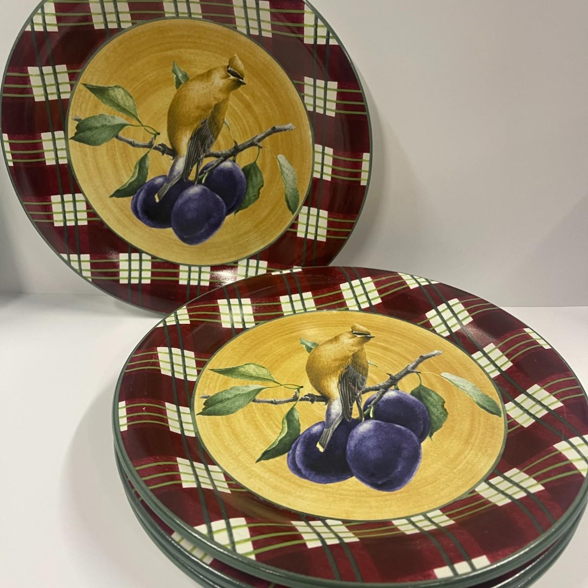 Set of 4 Lenox Winter Greetings Everyday Tartan Cedar Waxwing dinner plates, excellent condition. 10 1/2"