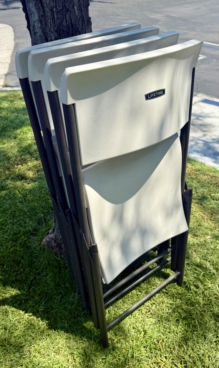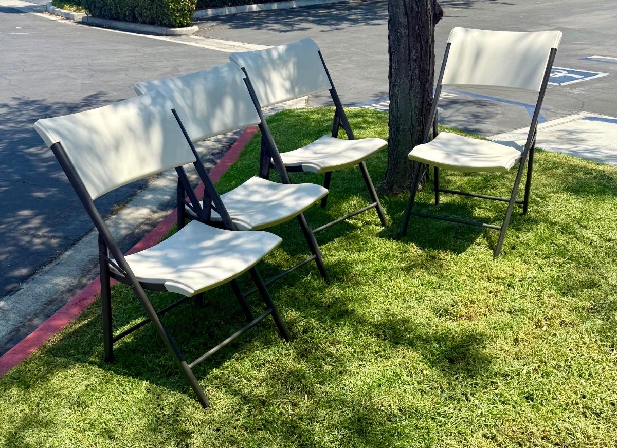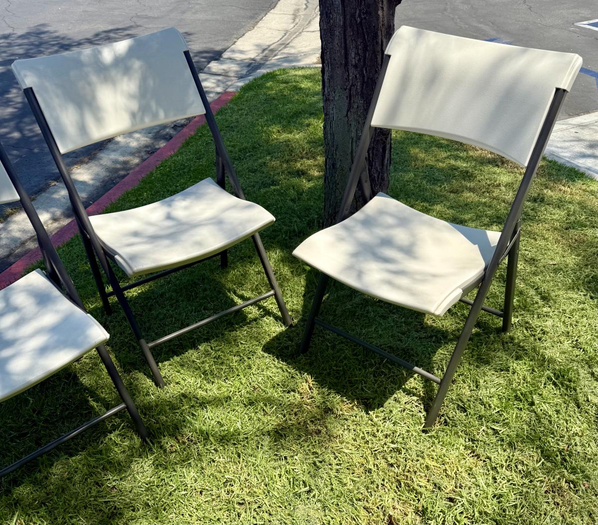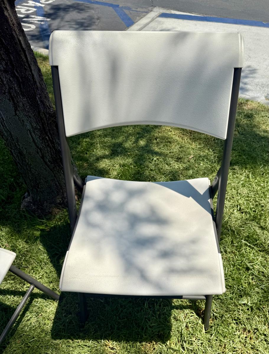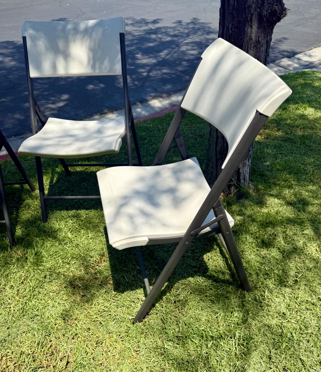 Metal frame with solid, hard plastic. seats and backs. Like-new condition.