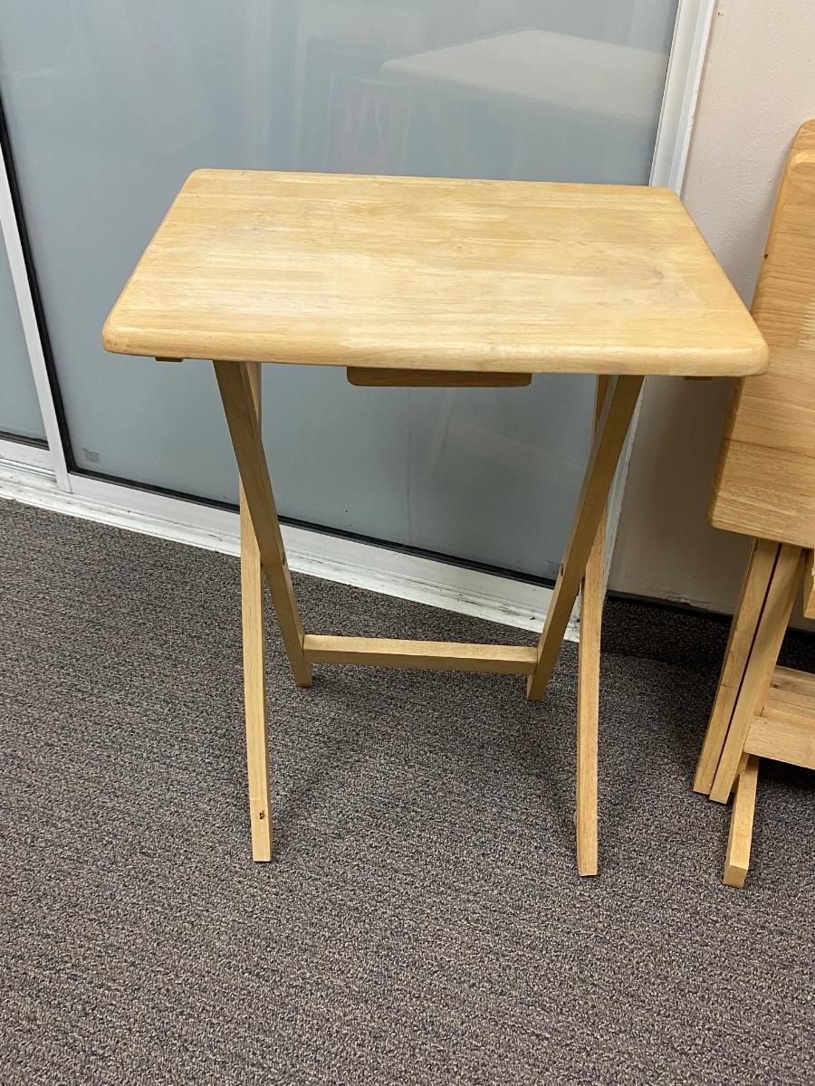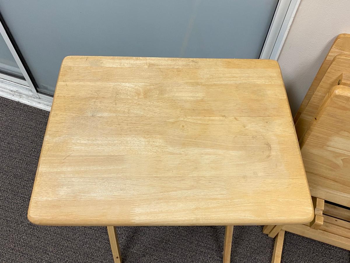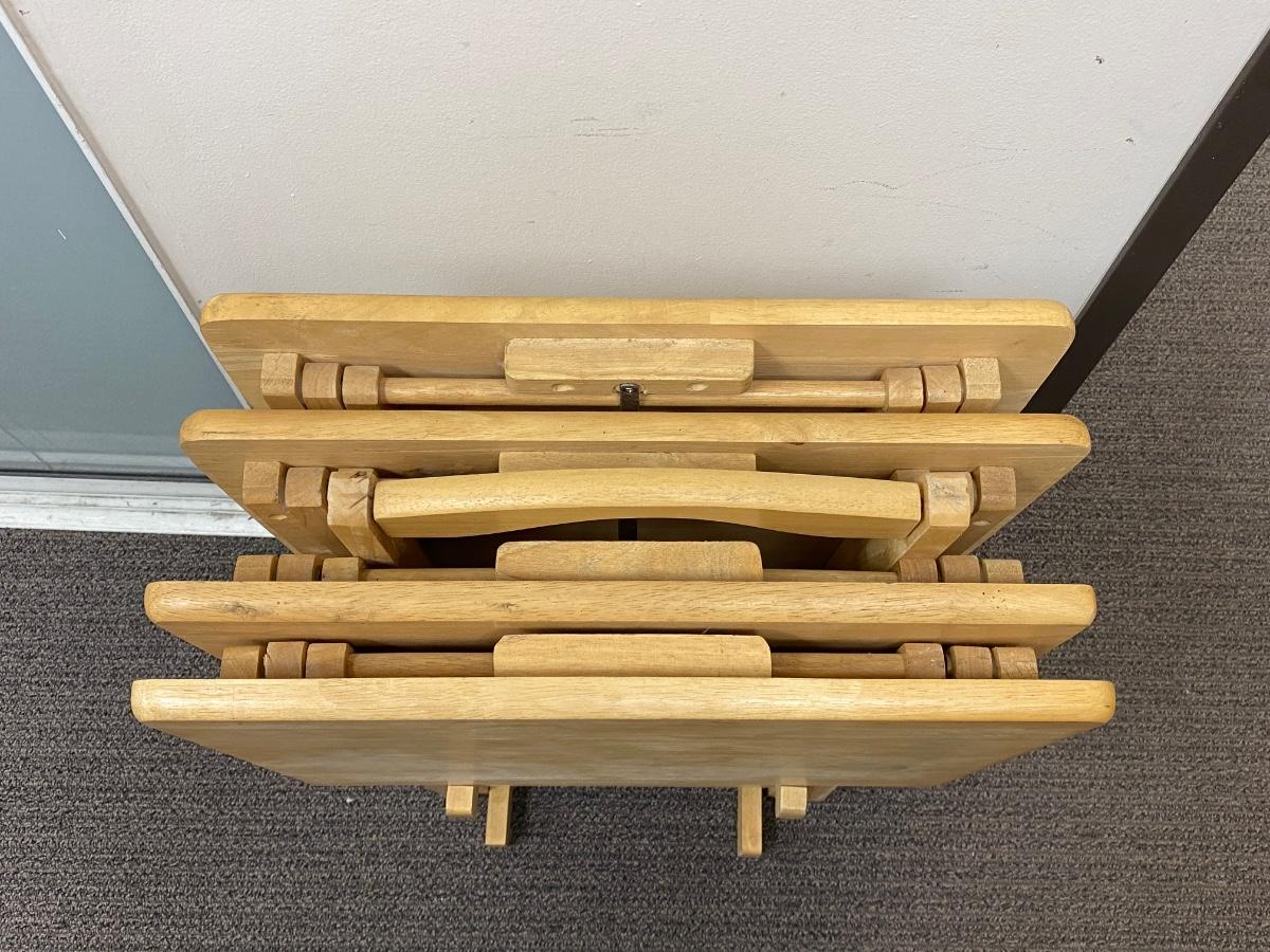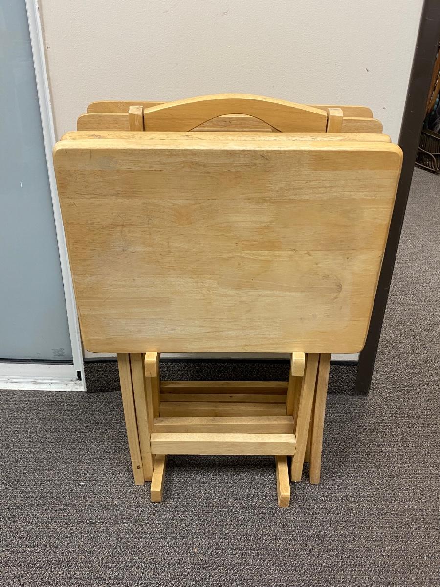 Set of 4 light finish TV tray tables with storage rack. In fair condition, some signs of age and use. One has a little warp to legs but stands ok. Good as is or for refinishing.