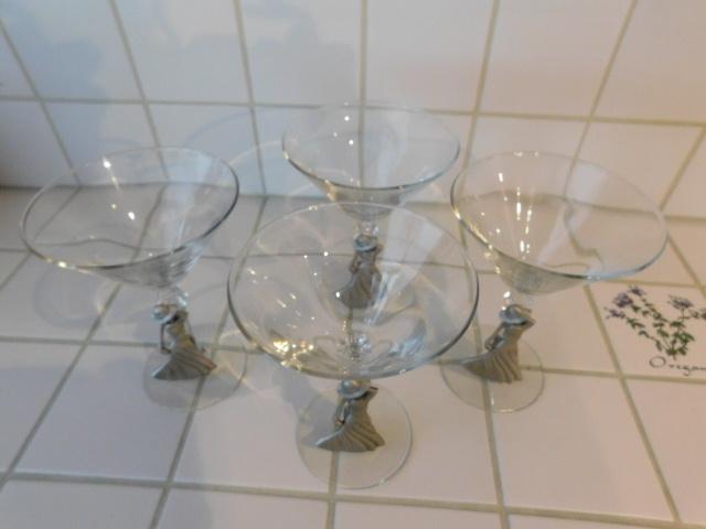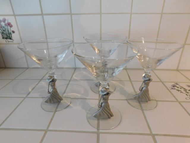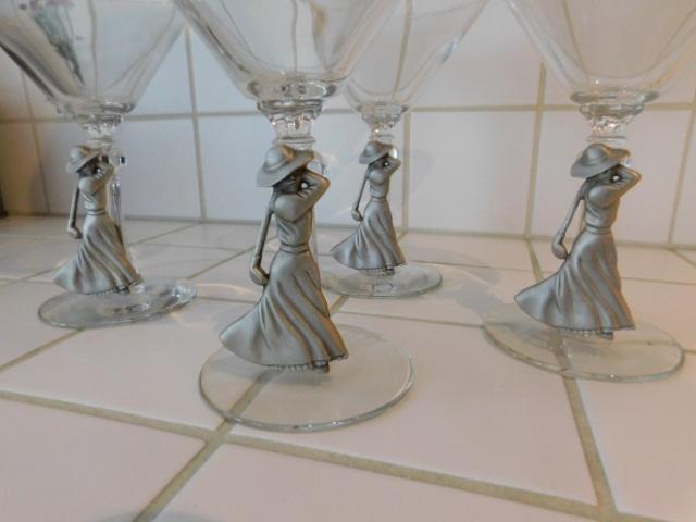 Set of 4 Martini Glasses with Pewter Shields Depicting Vintage Woman Golfer