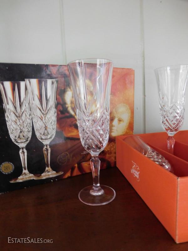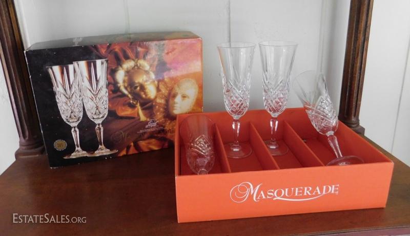 Like new set of four Masquerade crystal champagne flutes. Nice pressed 24% plus lead crystal with solid stem. Shipping Available.