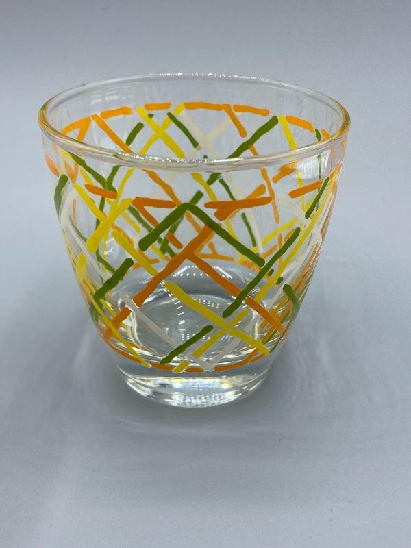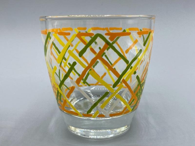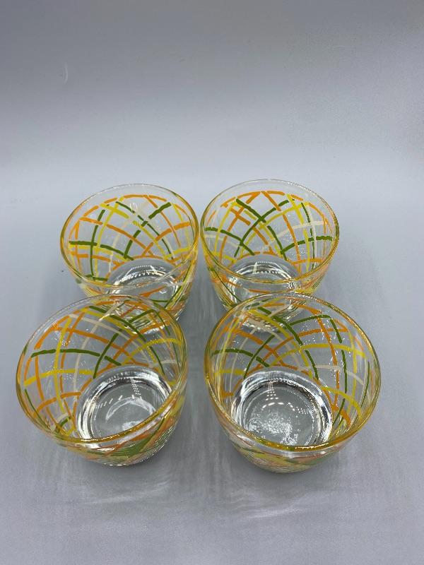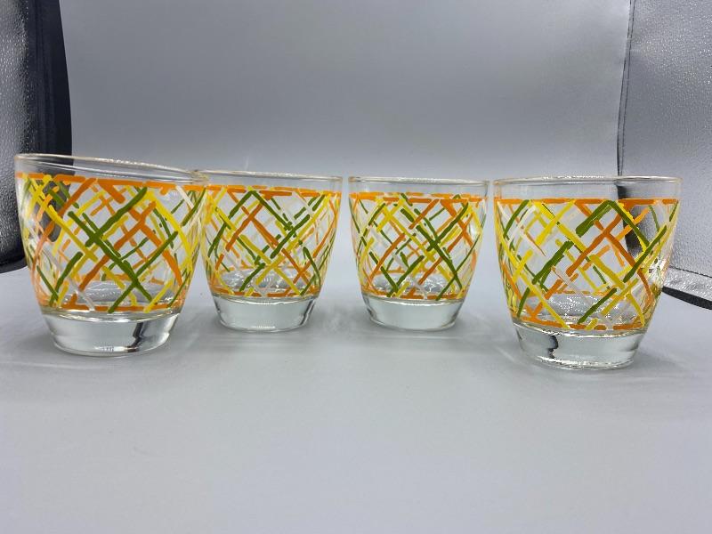 Set of 4 MCM Libbey highball glasses. Retro color pattern in green, orange, yellow, and white, looks like a loose basket weave design. Excellent condition. About 3.5" tall, heavy bottom. Very faint Libbey "L" on the bottoms.