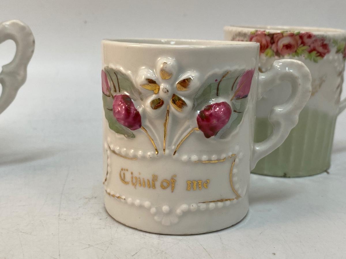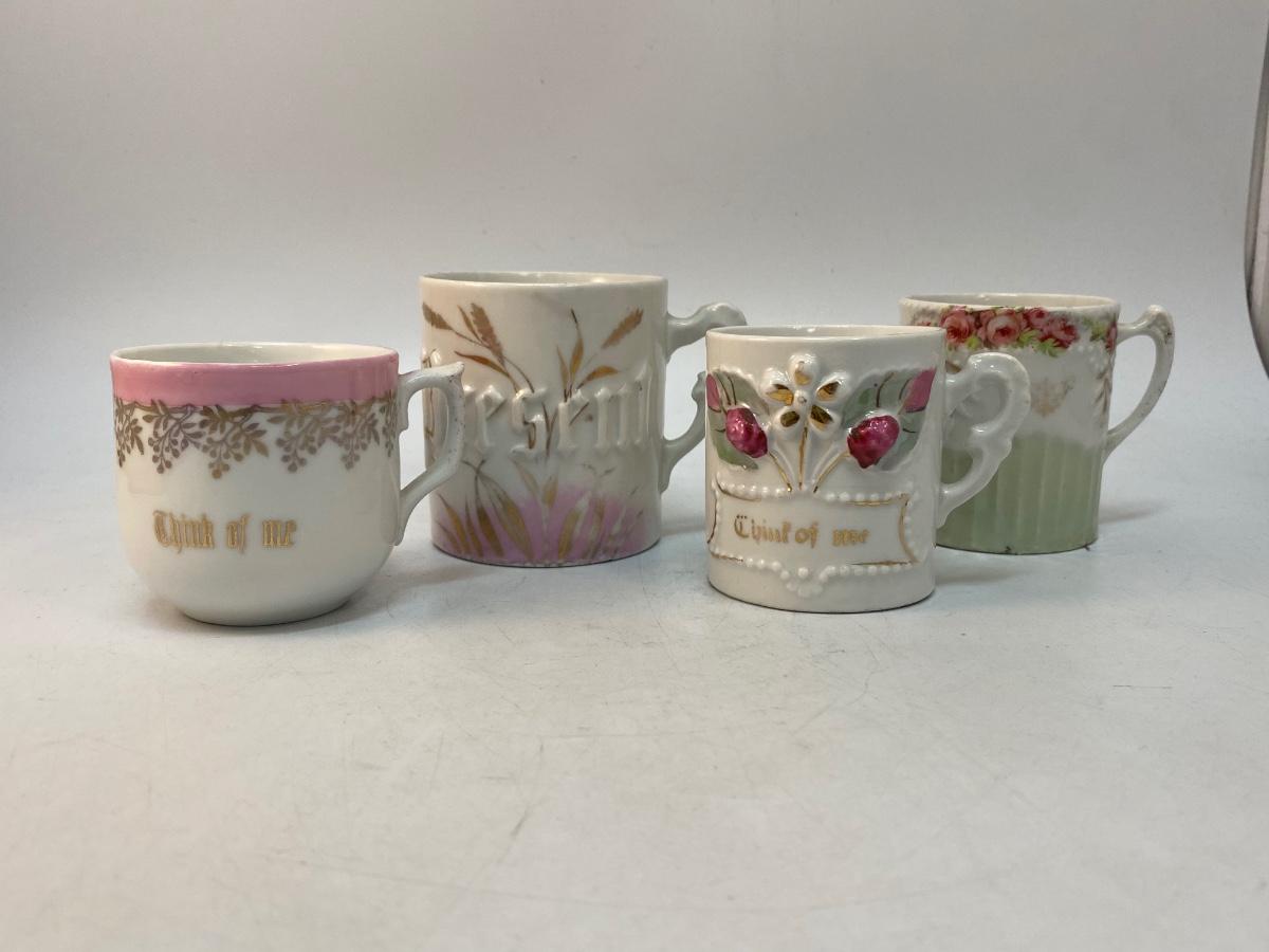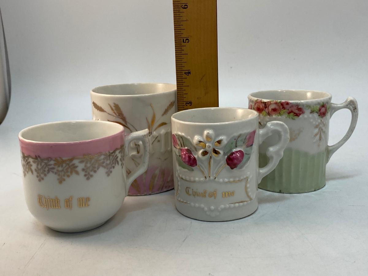 Set of 4 Mismatched Vintage Antique Porcelain Teacups Think of Me. Each one a little different but all look good together. Two are "Think of Me" cups, one has the word "Present" on it, and the other has nothing but flower pattern. In vintage condition with wear to pattern, no chips along the rims but a couple small chips on the underside edge. Under 3.5" size.