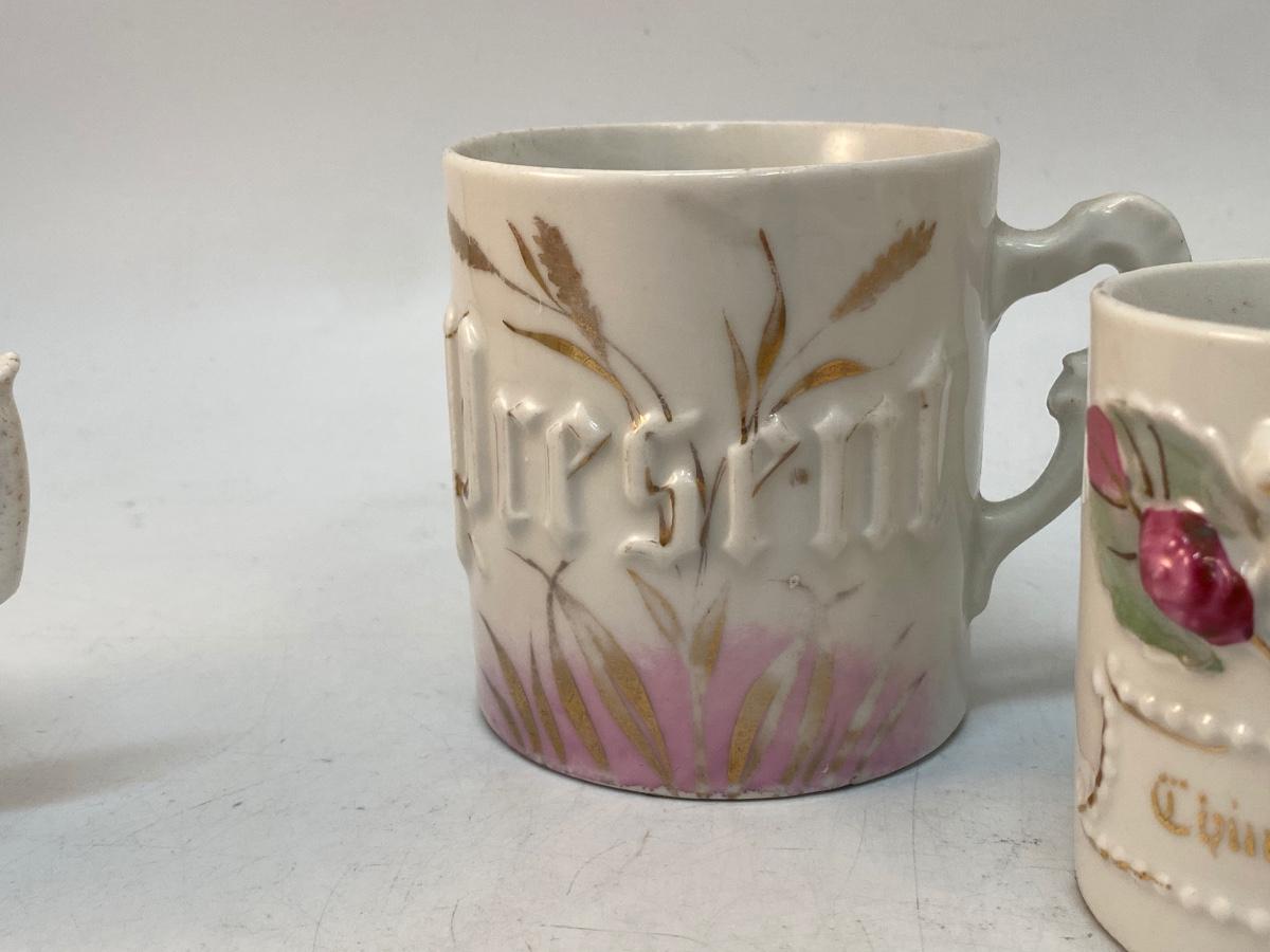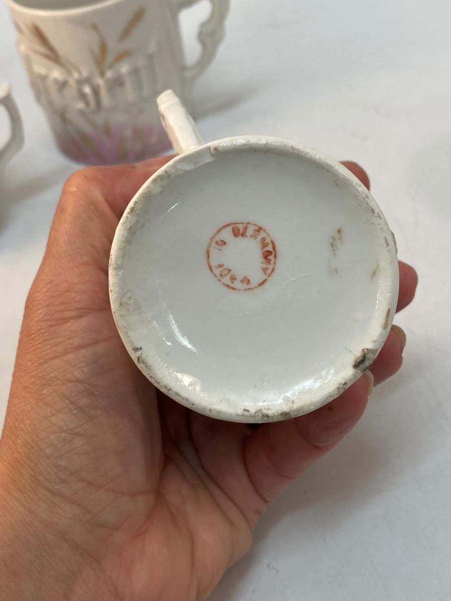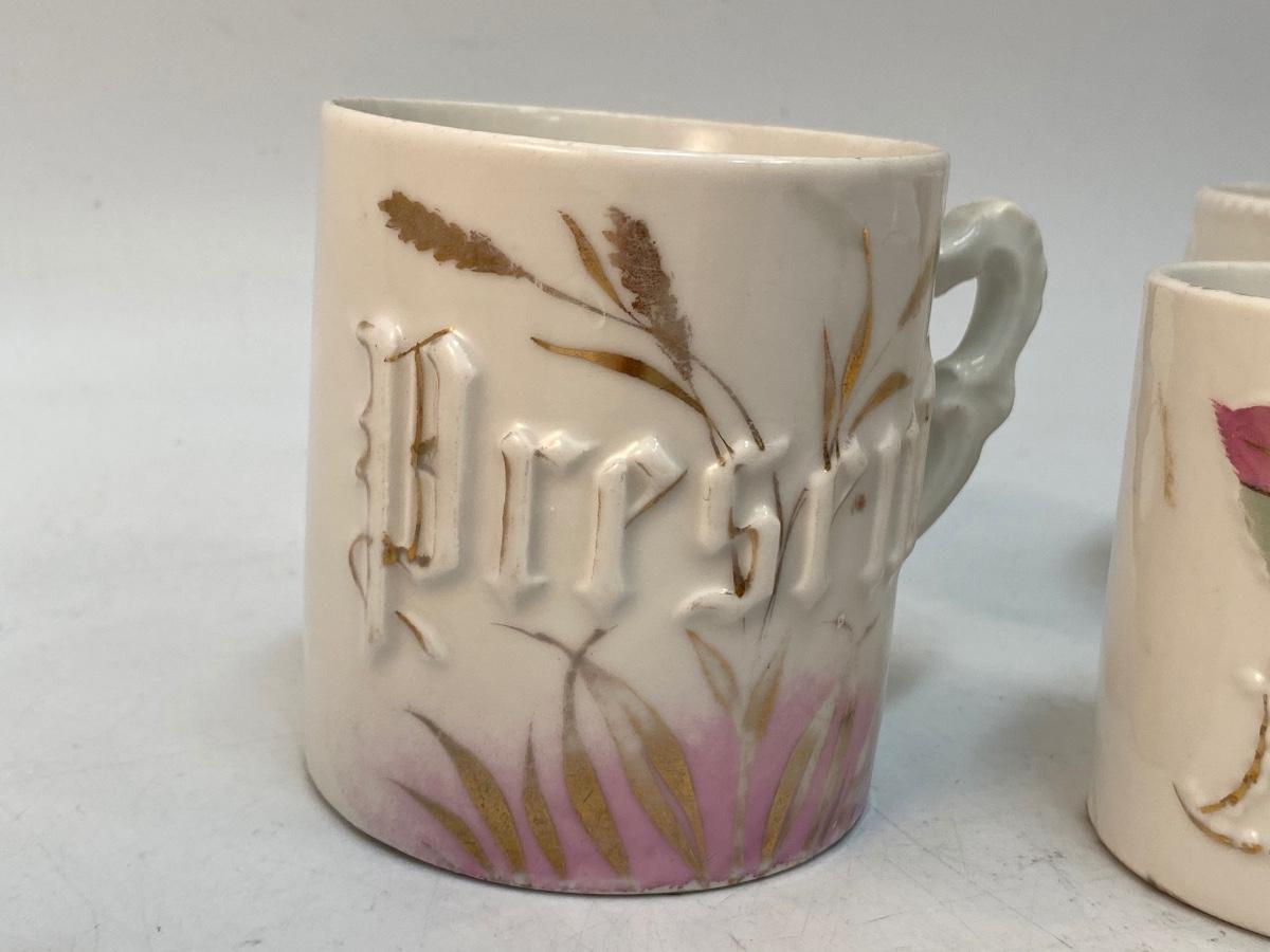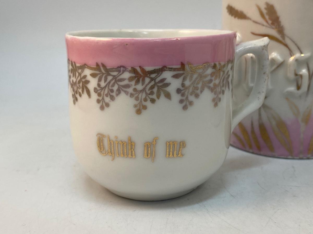Set of 4 Mismatched Vintage Antique Porcelain Teacups Think of Me. Each one a little different but all look good together. Two are "Think of Me" cups, one has the word "Present" on it, and the other has nothing but flower pattern. In vintage condition with wear to pattern, no chips along the rims but a couple small chips on the underside edge. Under 3.5" size.