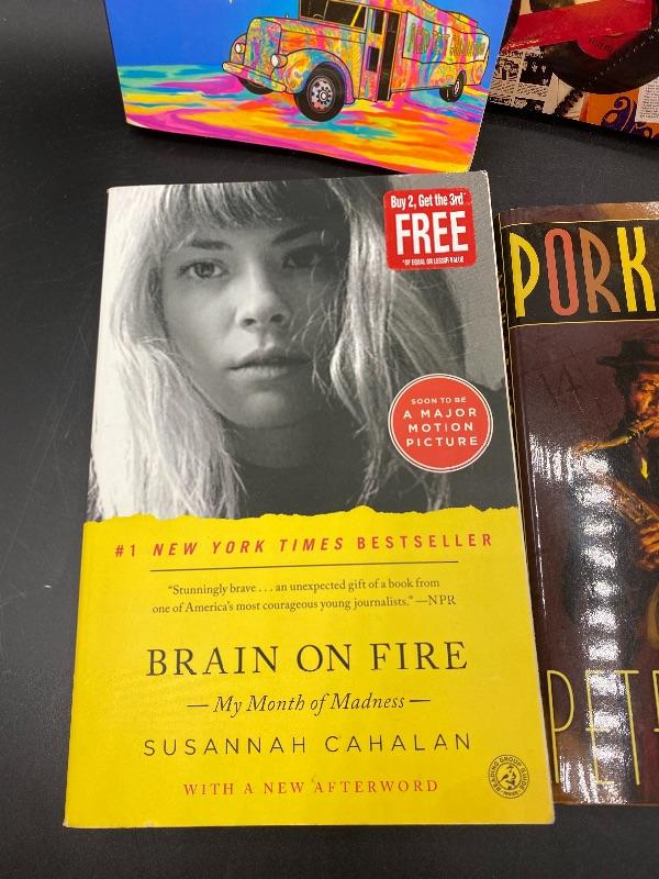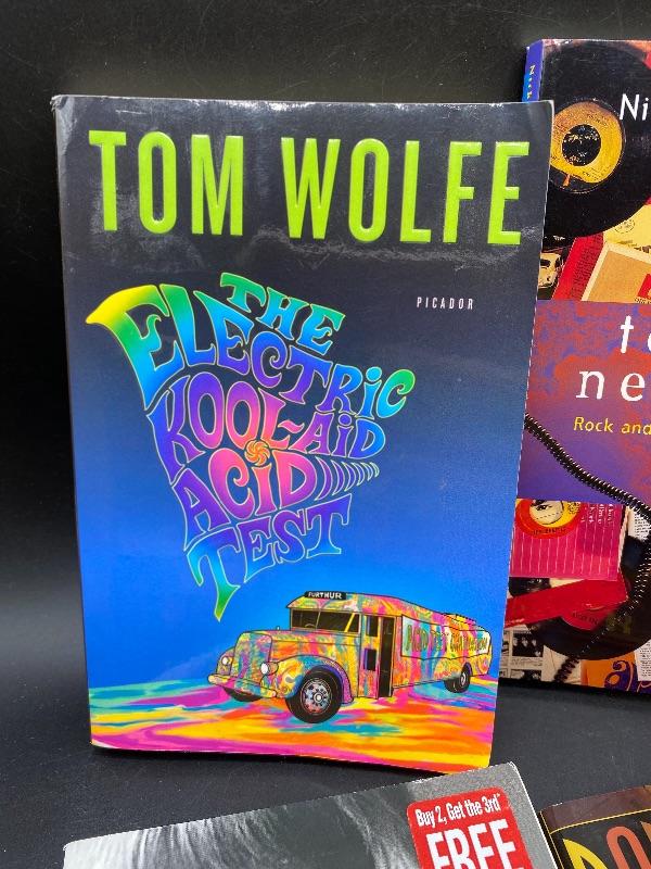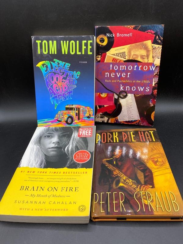 Set of 4 must read books. Titles include "Pork Pie Hat", "Tomorrow Never Knows Rock and Psychedelics in the 1960s". "The Electric Kool-Aid Acid Test", and "Brain on Fire My Month of Madness". All are in previously read condition.
